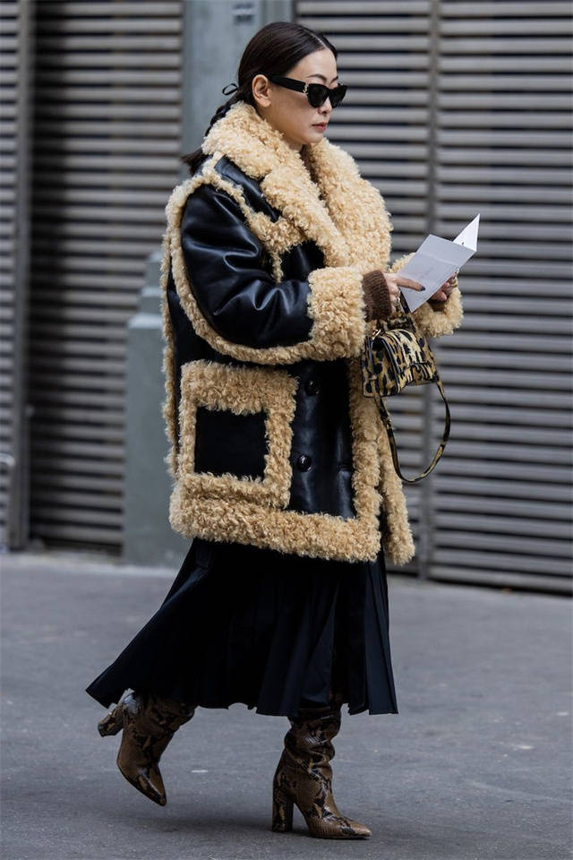 羊皮毛外套的宽大廓形能够带来时尚感和独特性,而长长的黑色百褶裙则能够增加女性化的氛围。