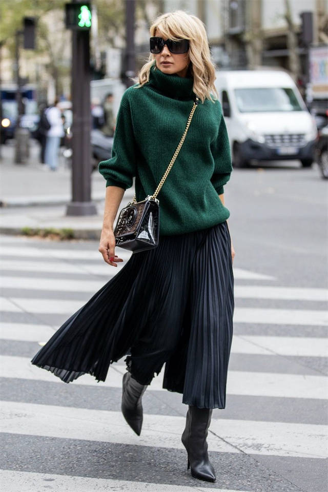 深绿色和黑色的结合,营造出冷静和时髦感,这种颜色的搭配,展现出稳重和优雅的氛围。 轻柔飘逸的百褶长裙,使整体造型更加柔和。