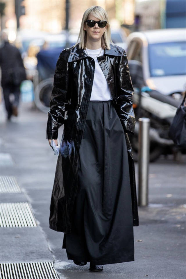 闪光材质的喇叭形长裙,搭配漆皮外套,打造出富有表现力,这样的搭配展现出时尚和个性。