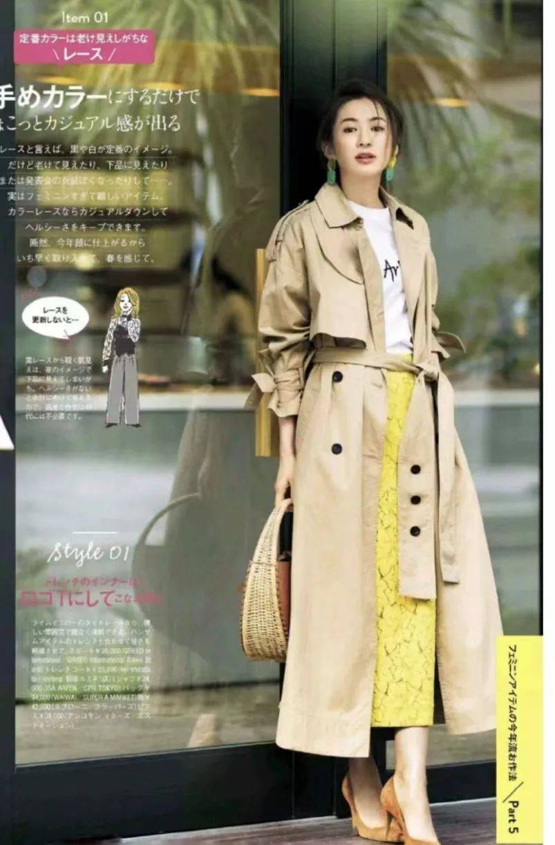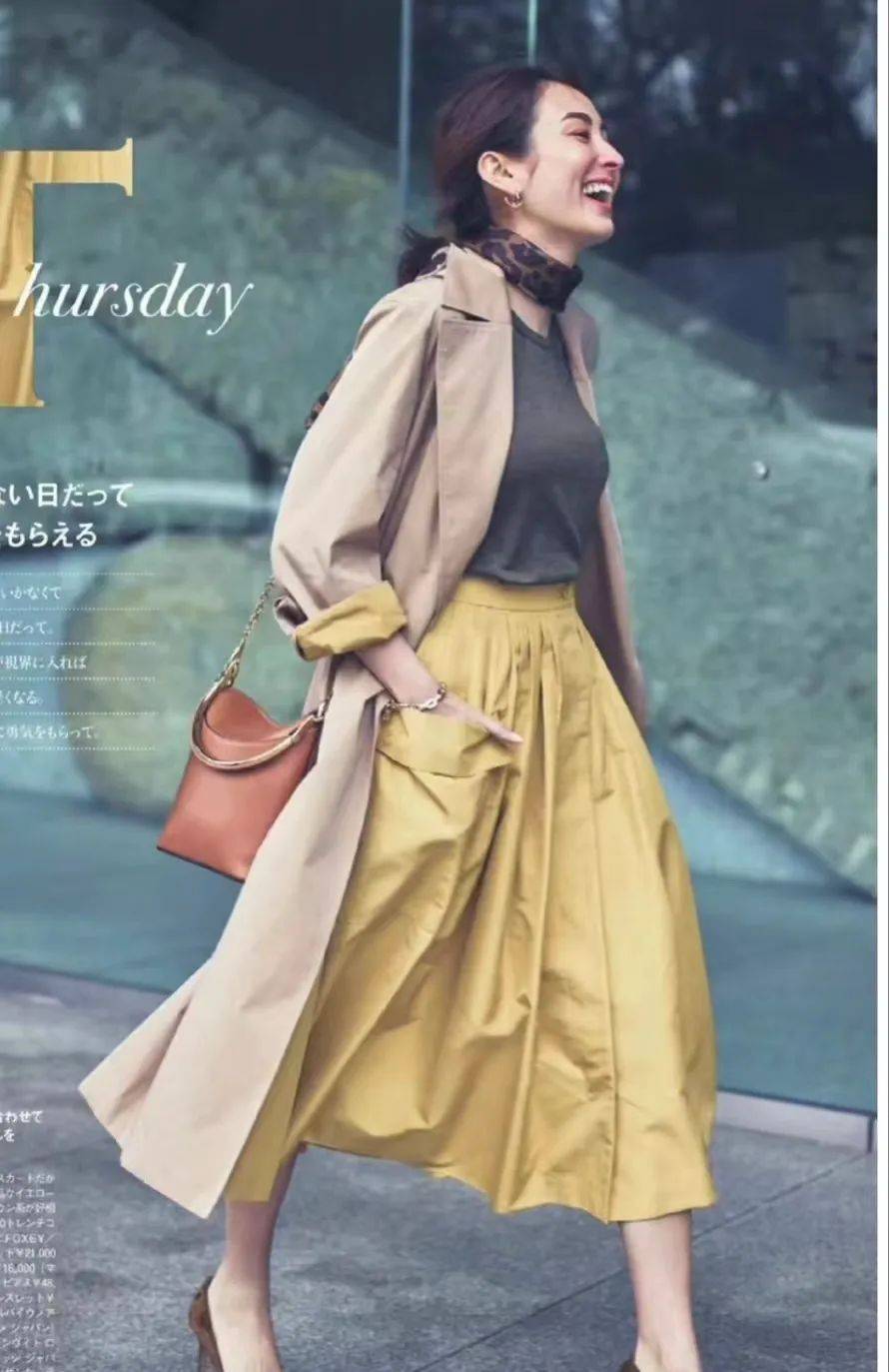 风衣与半身裙的搭配,有一种优雅与俏皮并存的气质感。特别是选择一款长款的风衣,再搭配一条高腰艳丽的半身裙,穿一双高跟鞋,整体造型就会变得时尚年轻。