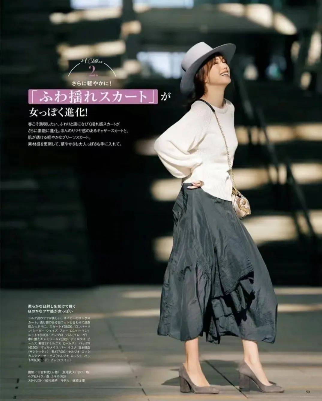 也可以将毛衣塞进半身裙中,这样可以提高腰线,让身材比例更加完美。