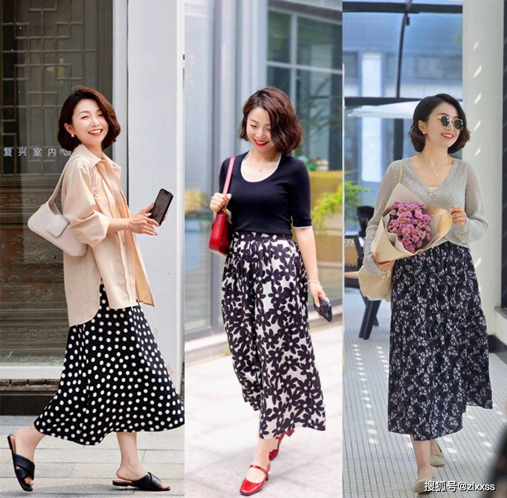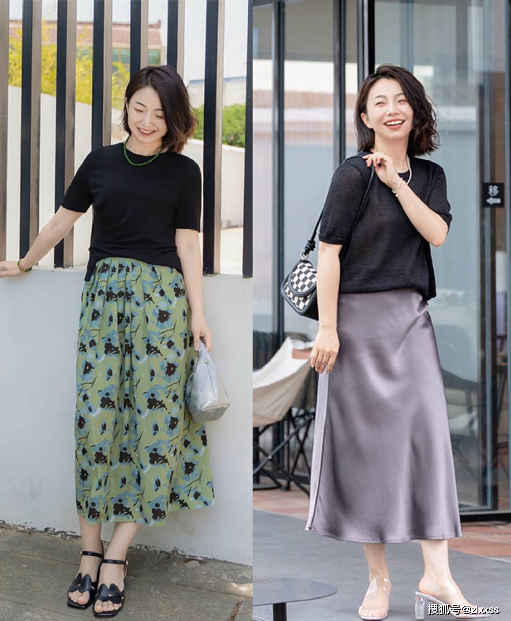 在选择的时候,裙长最好能及至小腿中部,既能有效地遮挡住腿部赘肉,又能和同色、或是撞色的小衫相配,展现自己的独特韵味与高级感。