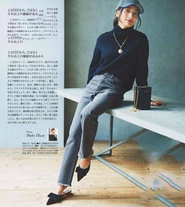 高领的毛衣,更适合脖子长的女生穿,如果你是脸圆,脖子比较短的,那么可以试试半高领的毛衣,经典黑色,百搭且能穿出瘦身的效果。搭配一条蓝色牛仔裤,就莫名塑造出一种大女人范的既视感,既不失帅气又充满女人味,再搭配上一双黑色靴子,整个人看起来就很气质。