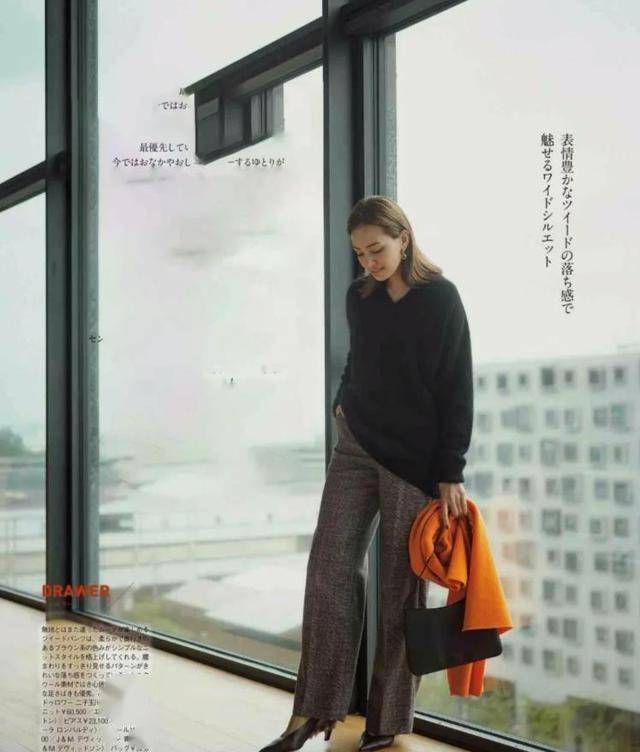 这款黑色v领毛衣,穿起来可显瘦了,搭配一条灰色西装阔腿裤,可以营造出女性的自信,毫不费力就展现出一种个性和魅力,脚下一双高跟鞋,又散发出一种不经意的知性和魅力。