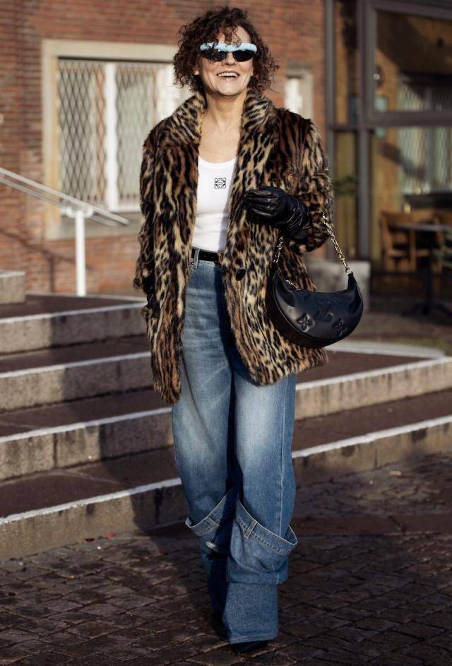 豹纹外套搭配白色针织衫、蓝色牛仔裤等熟悉的休闲单品,既能营造出休闲的氛围,又不会给人过于刺眼的印象。为了保持时尚的外观,请为牛仔裤选择独特的设计。配件均采用黑色皮革制成,营造出平衡而别致的外观。