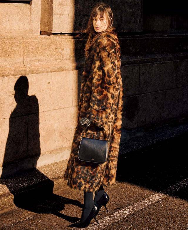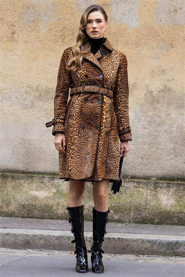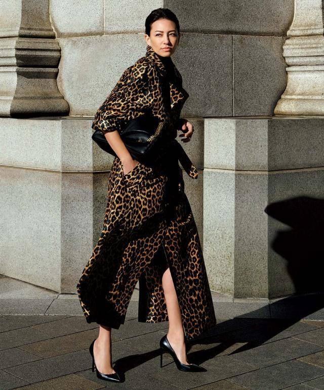 这款极具冲击力的豹纹风衣吸引了所有人的注意力。虽然乍一看似乎很难,但膝盖以上的中长长度和修身垂直廓形,会让人看起来很淑女。从衣领处露出黑色高领内搭,可以给人一种更加优雅的印象。