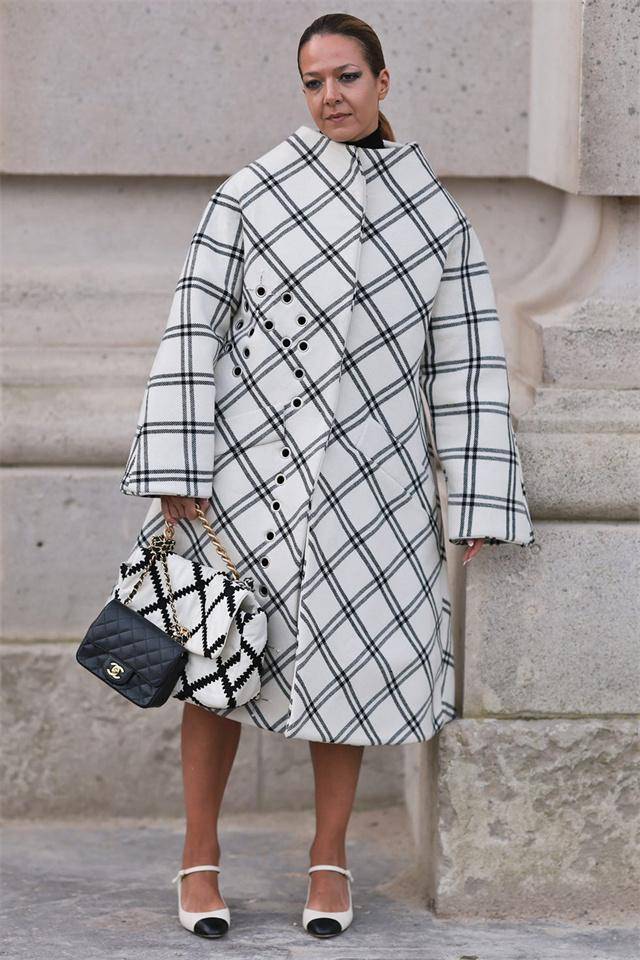 中长款 A 字型大衣,采用醒目的图形格纹图案和立体造型。黑白色系的穿搭以外套为设计蓝本,玛丽珍的颜色变化鲜明,营造出复古情调。