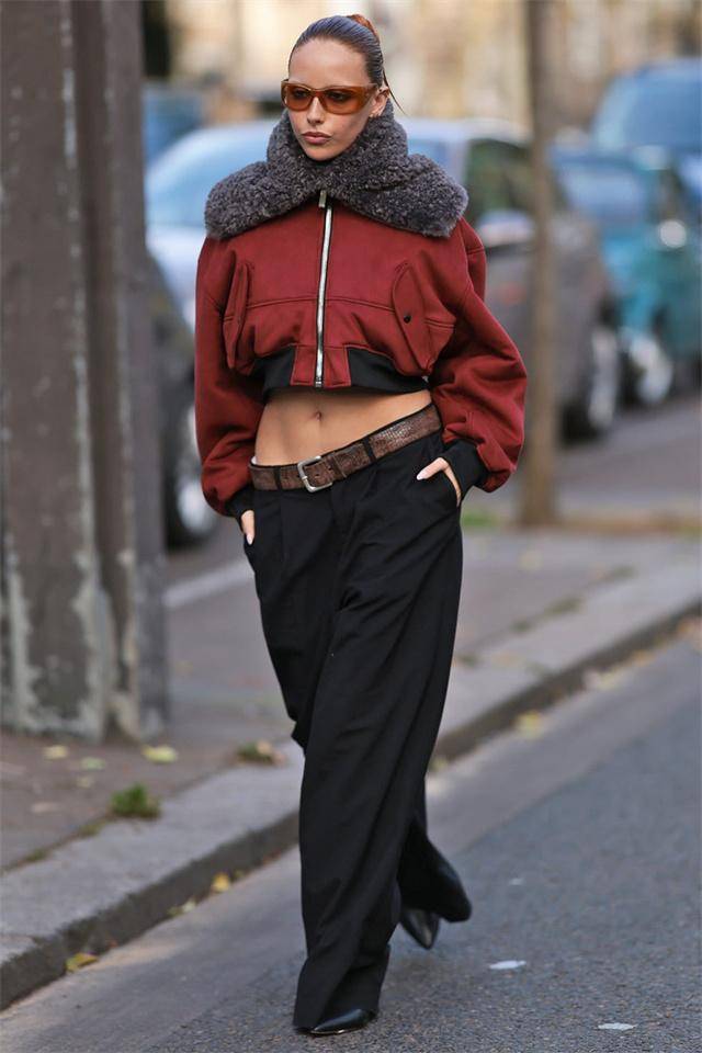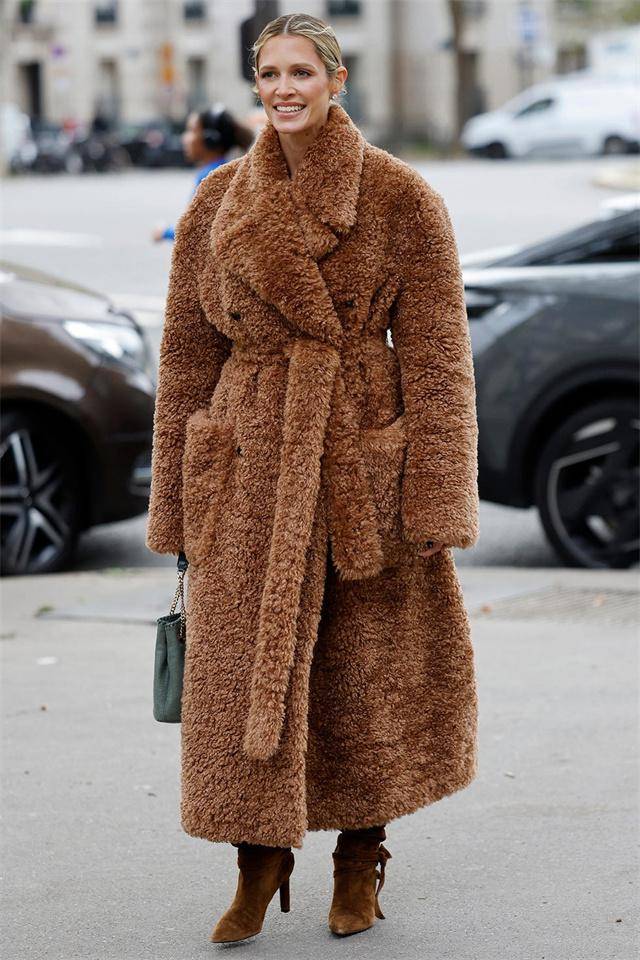 时尚中不可或缺的泰迪长毛皮大衣。通过将腰带标记放置在略高于腰部的位置,可以为服装的整体轮廓增添清晰度,同时也可以拉长腿部效果。从外套下摆露出一缕时髦的麂皮靴子,也是提升造型的有效技巧。