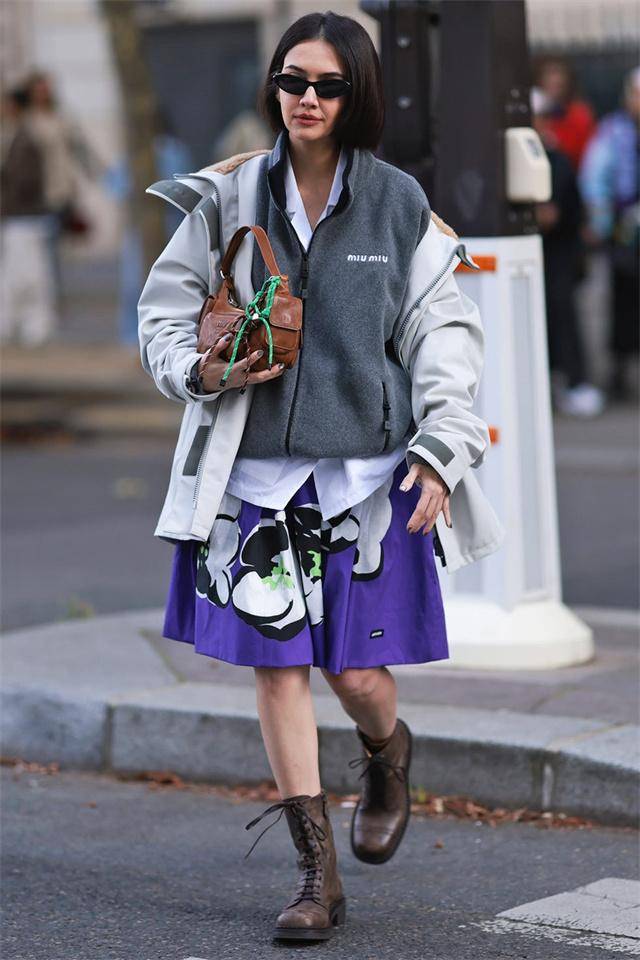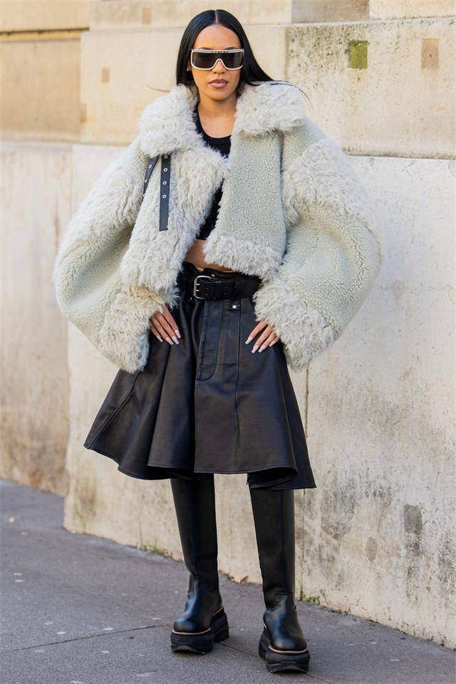 毛皮和蟒蛇只需添加一件即可营造出秋冬季节的感觉。成功的关键是融入引人注目的设计,例如大袖和宽松布局的经典机车夹克,将不同的材质与皮裙混搭!