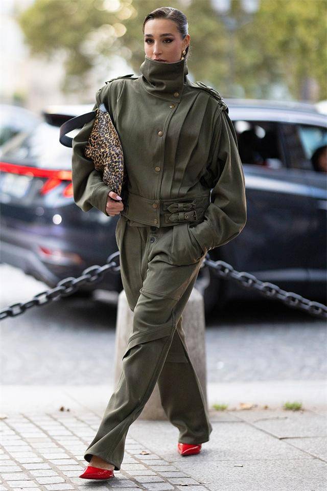 这款短款夹克充满军事元素,如高领、肩章和腰带。添加一些亮红色高跟鞋作为点缀,为帅气的单色调服装增添趣味!