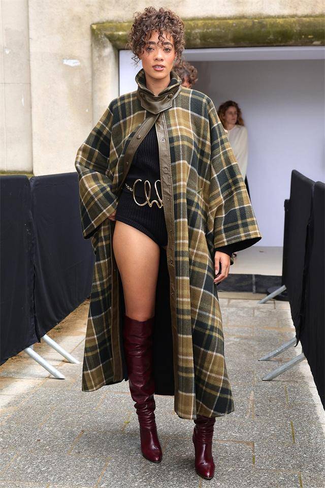 这款经典的格子外套不仅设计时尚,而且可以大胆地披在全身,打造时尚造型。 Rain Judge穿着宽松的毛呢大衣很好看,只扣了脖子处的纽扣,展现出她内在的协调性。卡其色格纹图案和酒红色靴子非常相配。