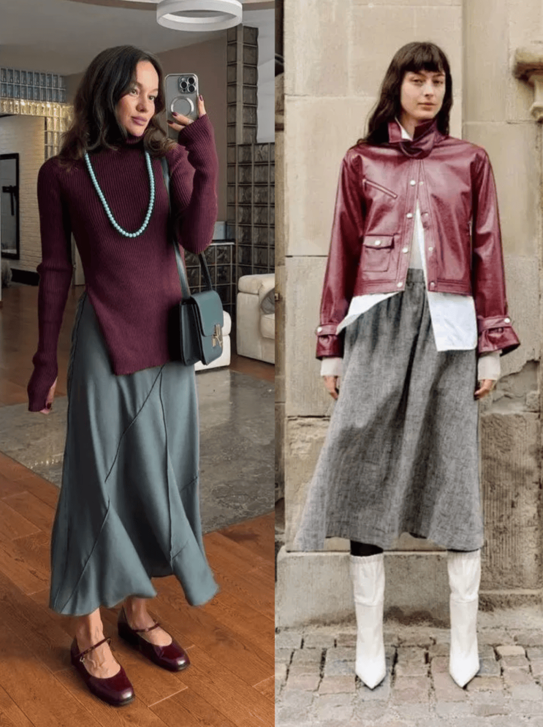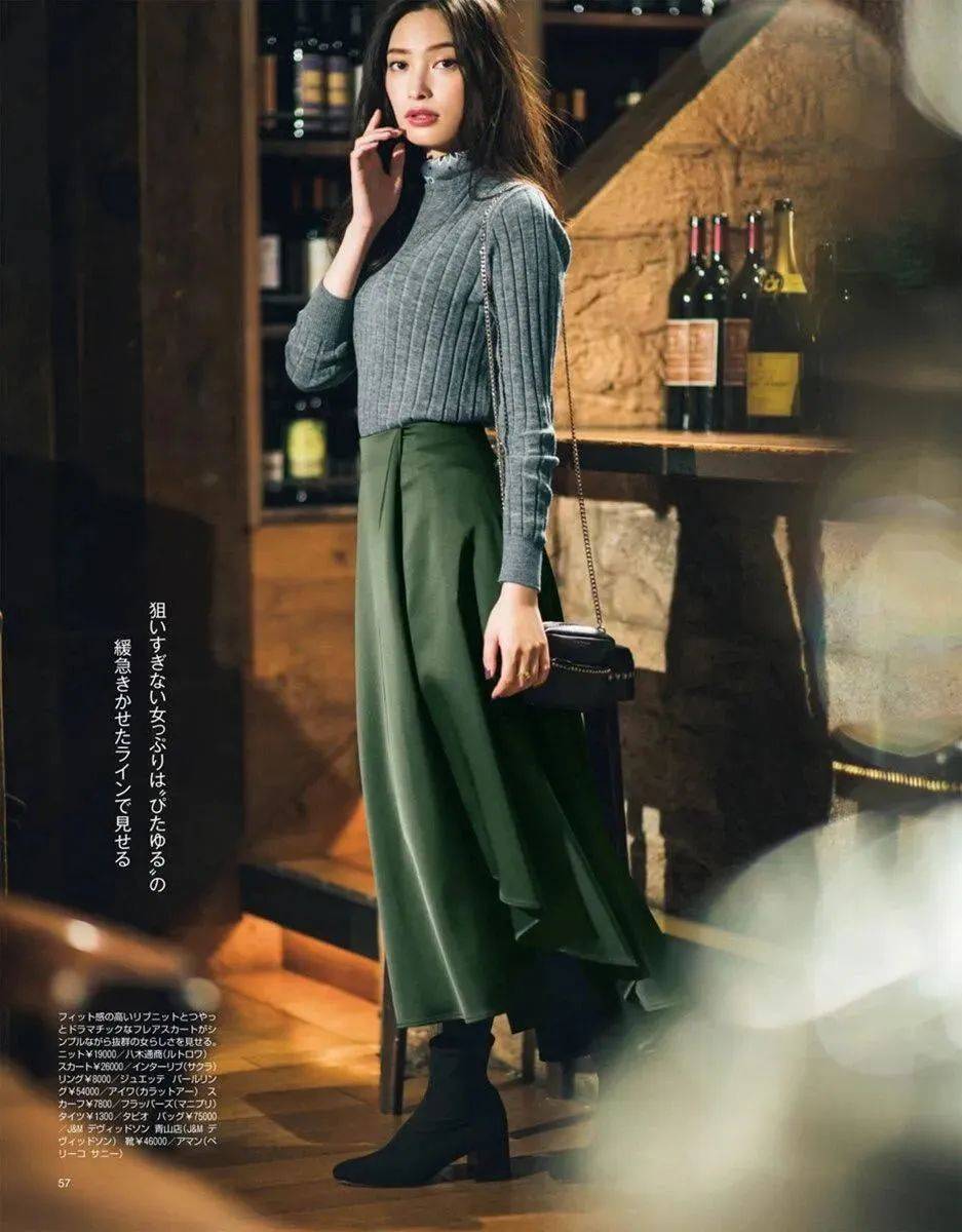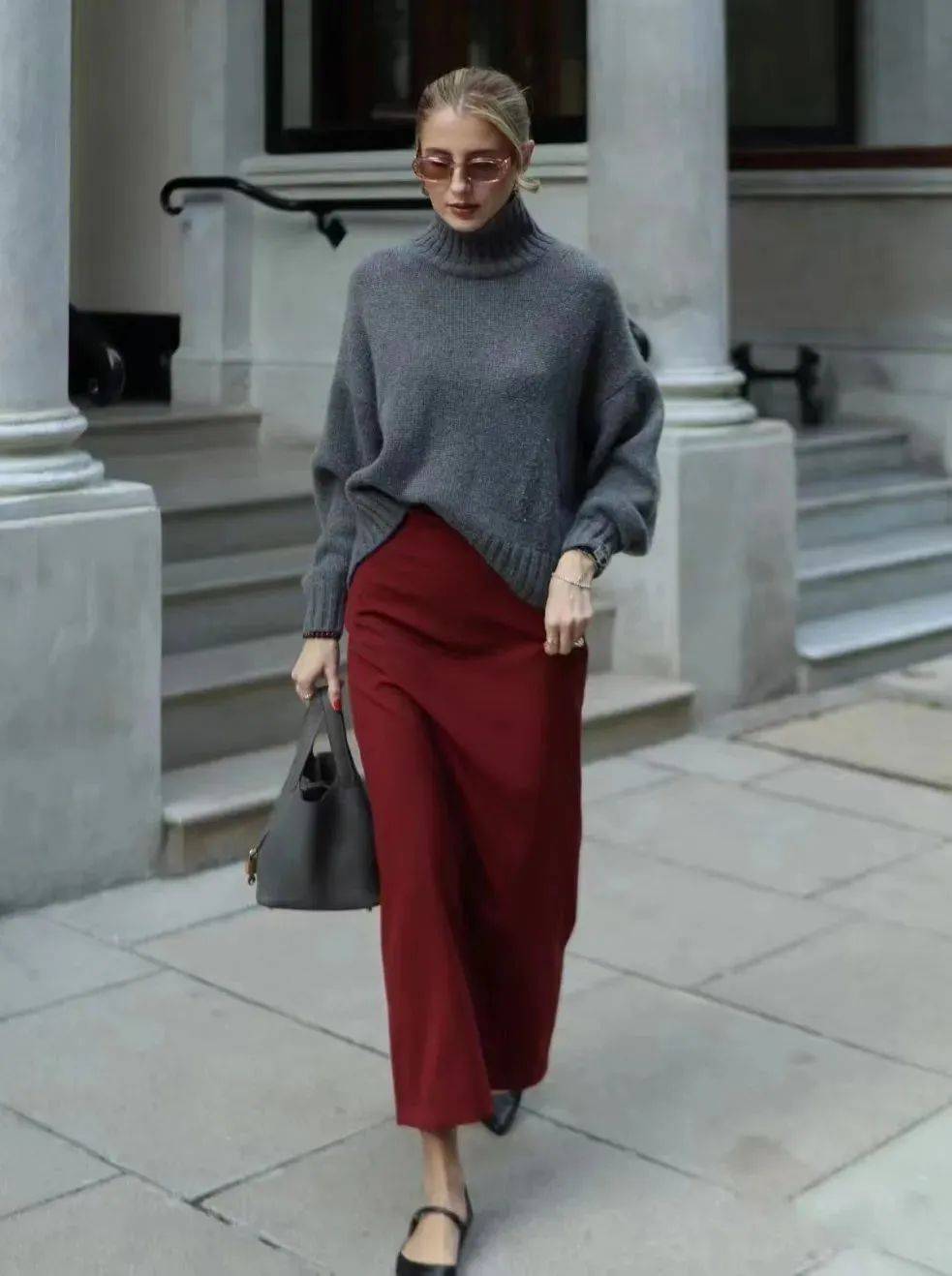 灰色的针织衫搭配安可拉红色的长裙,从直筒裙到A字裙,从高腰裙到及踝裙,每一种款式都能展现出不同的风格与韵味。