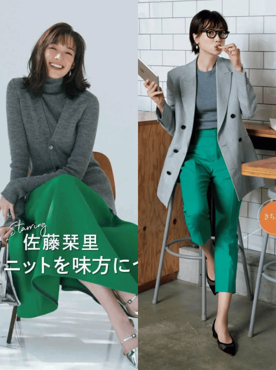 这一组合在秋冬穿时,可以选择深一点的绿色,有一种枝繁叶茂的生命力感。