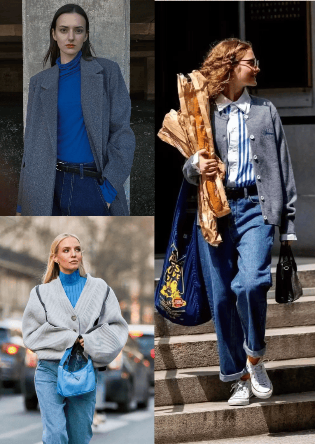 也可以选择深一点的、饱和度高一点的蓝色,让灰+蓝的对比感更加明显,视觉刺激感更加强烈。但是这种蓝色比较挑人,适合皮肤白皙的女孩,可以让它远离面部肌肤;或者化一个提气色的妆容。