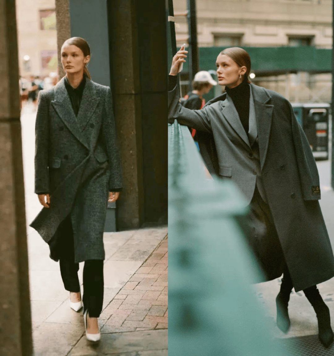 灰色大衣搭配黑色小高领衫,都选择基础款, 修身一点,演绎属于大女人的成熟大气风格。