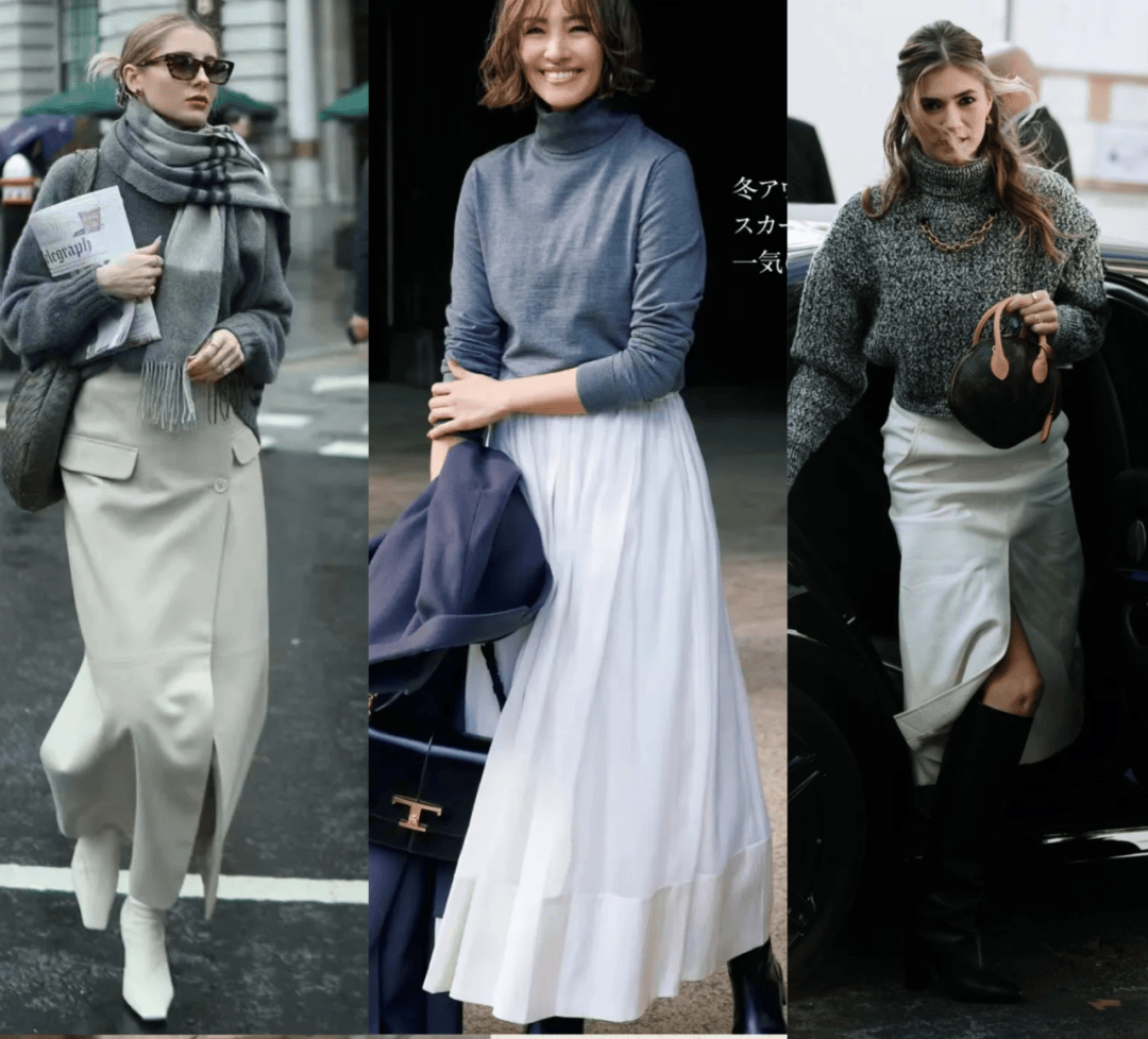 灰色与白色组合总是很清爽的,可以选择灰色毛衣搭配白色半裙,如果想要正式一点,那就选择直筒的OL风裙,如果想要飘逸一点,就选择材质柔软的伞裙,减龄又显白,很有女人味。