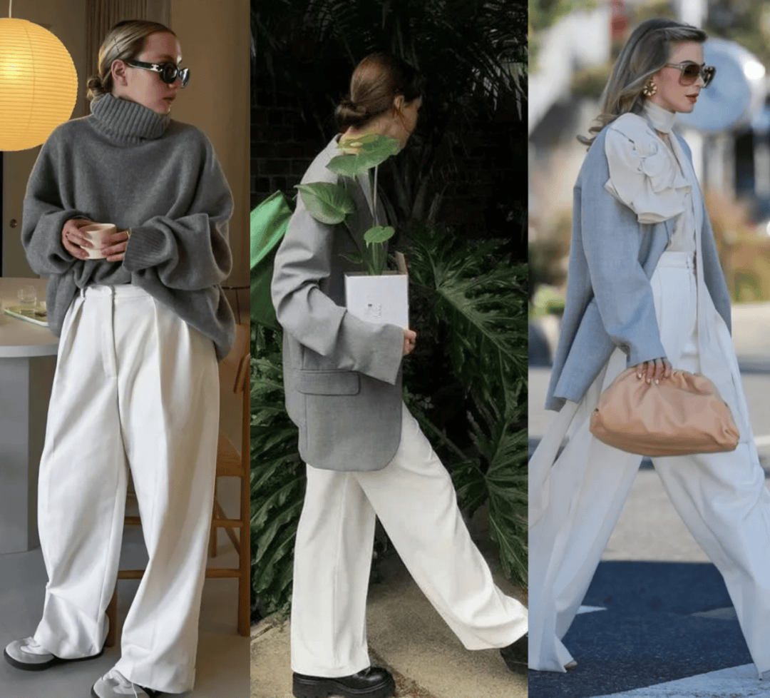 也可以搭配一条基础款白色阔腿裤,配灰色毛衣、灰色西装、灰色大衣,都很有风格,简练干净又透着优雅精致。