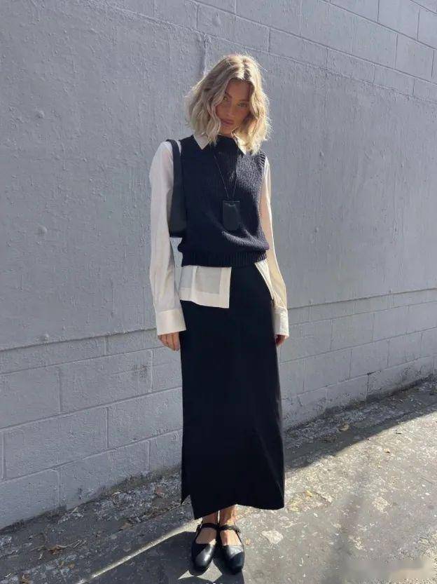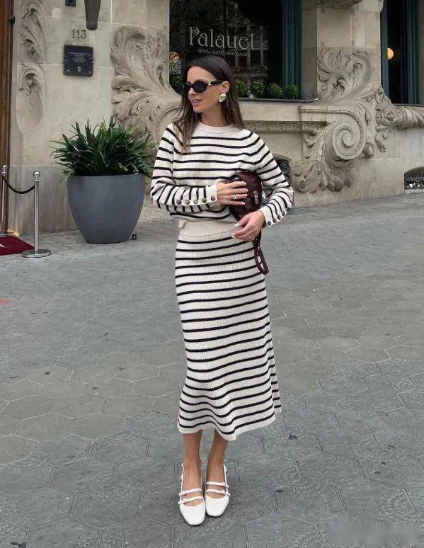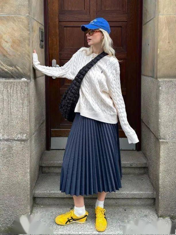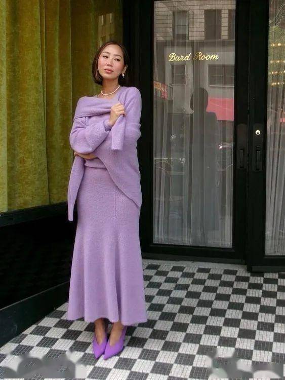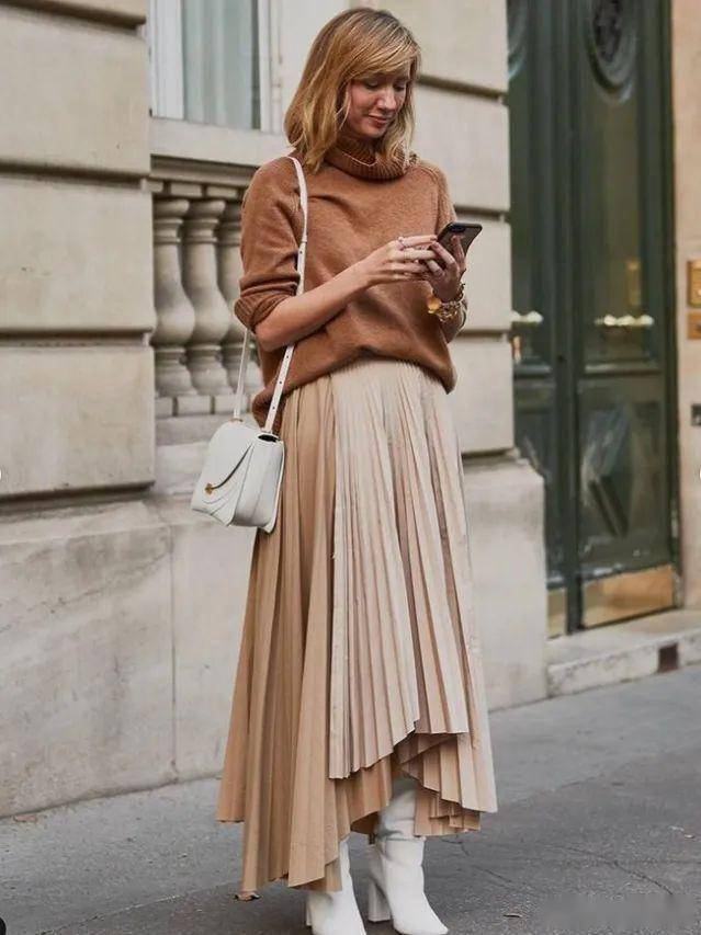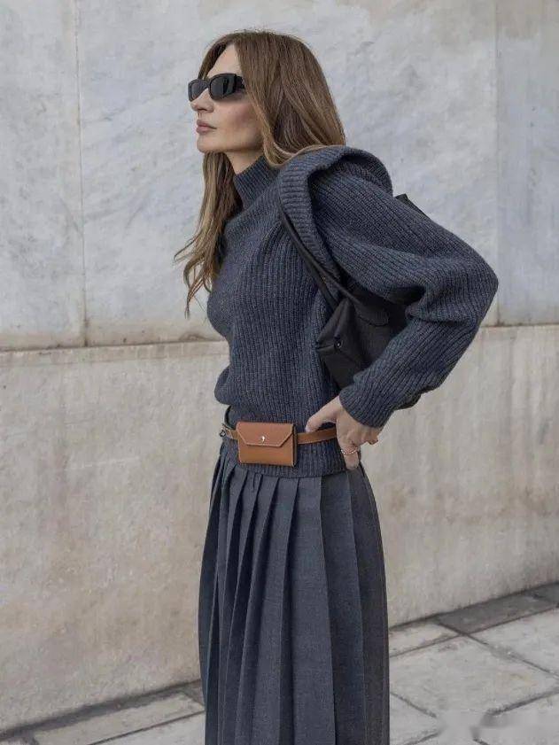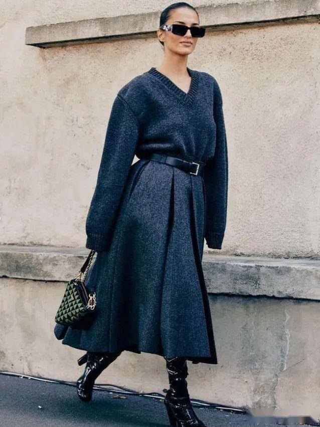 只是,针织半裙对自己还是有些许脾气的,纯羊毛或纯羊绒的面料更不易静电,半裙内穿着的单品也要学会避免臃肿。