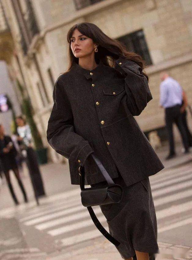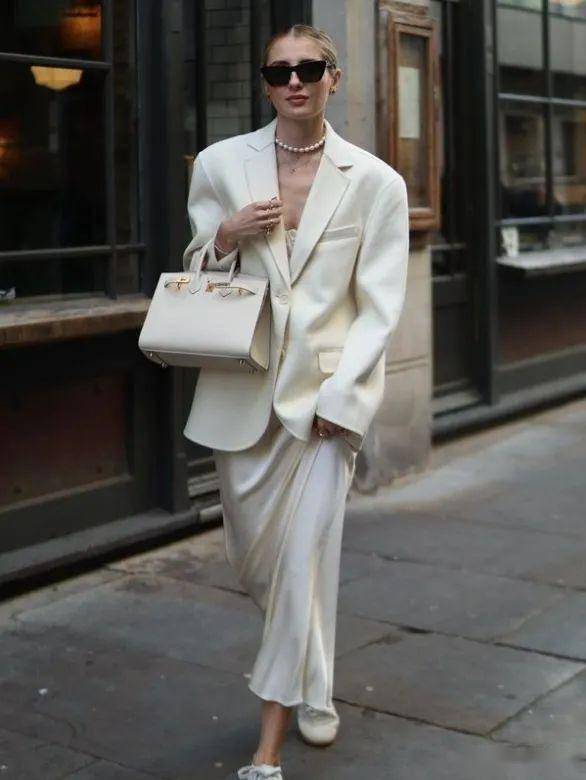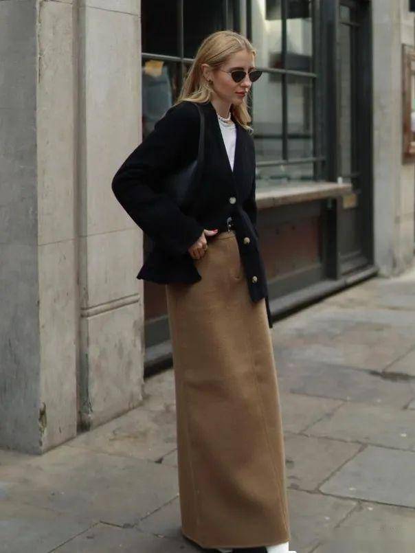 今年出现频率不减反增的,还有这样硬质感的直筒长半裙,微微包臀的视觉收紧,亦能很好地延伸身材比例,是小个子女士的心头好。