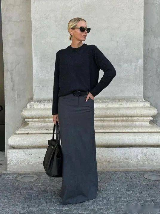 直筒长裙的美,在于空间视觉的包容度,弱化腿部线条,也给冬日留足了保温空间,150也能穿出160的高挑既视感。