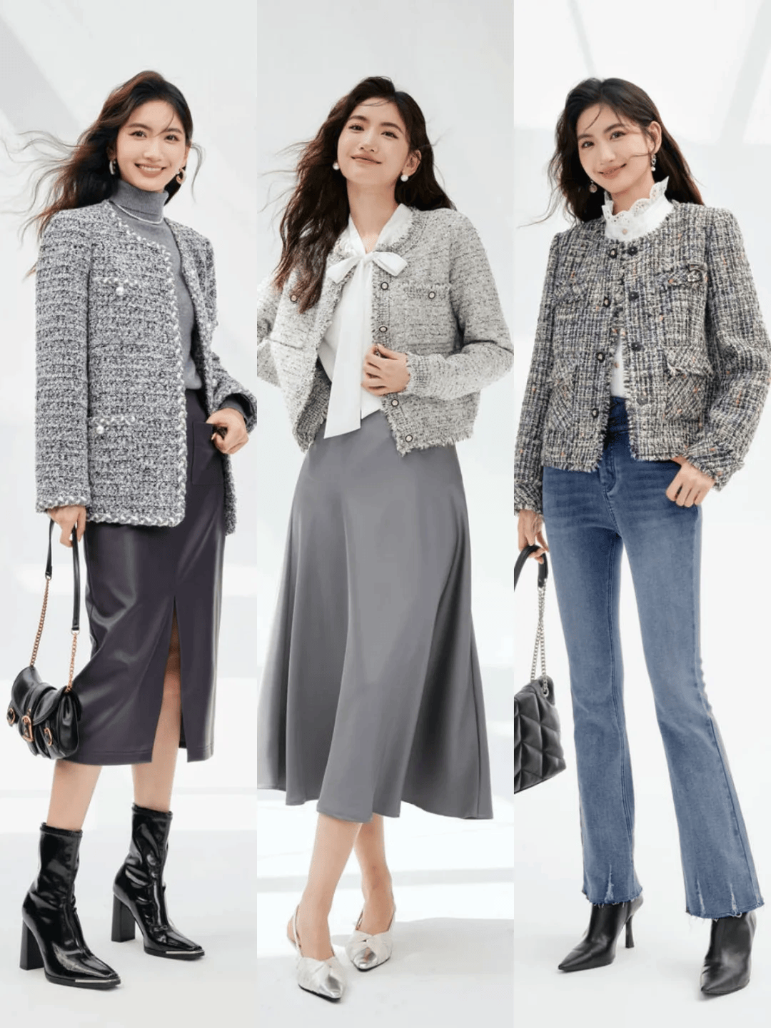 小香风外套,以其精致的剪裁与经典的设计,成为出席重要场合的首选。它不仅能够提升整体造型的质感,更能展现出女性知性、高贵的一面。而牛角扣大衣,则以其学院风的气息,赢得了众多追求减龄效果的女性的喜爱。灰色的牛角扣大衣,通过不对称的设计与细节处理,既保留了青春的活力,又增添了几分独特的个性魅力。