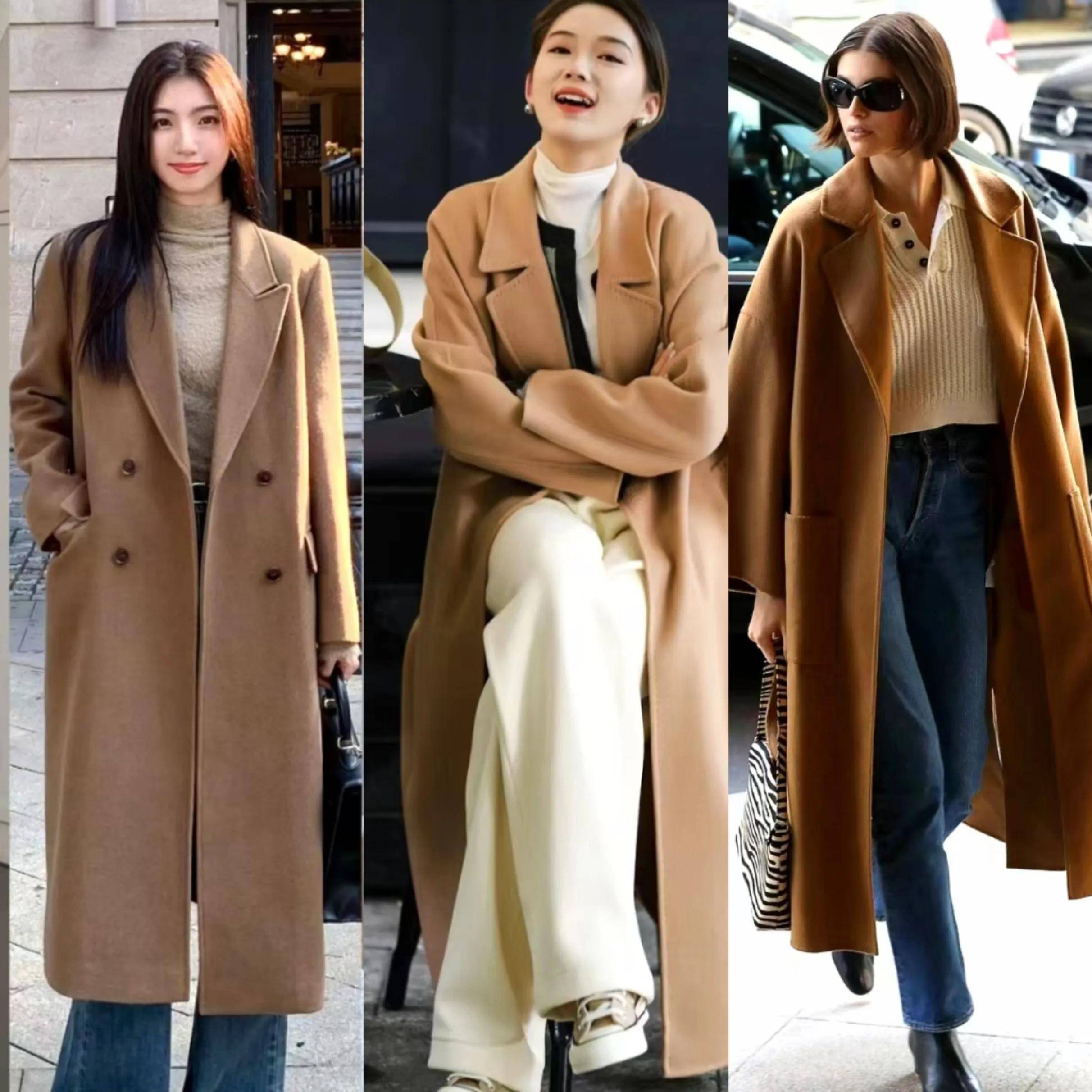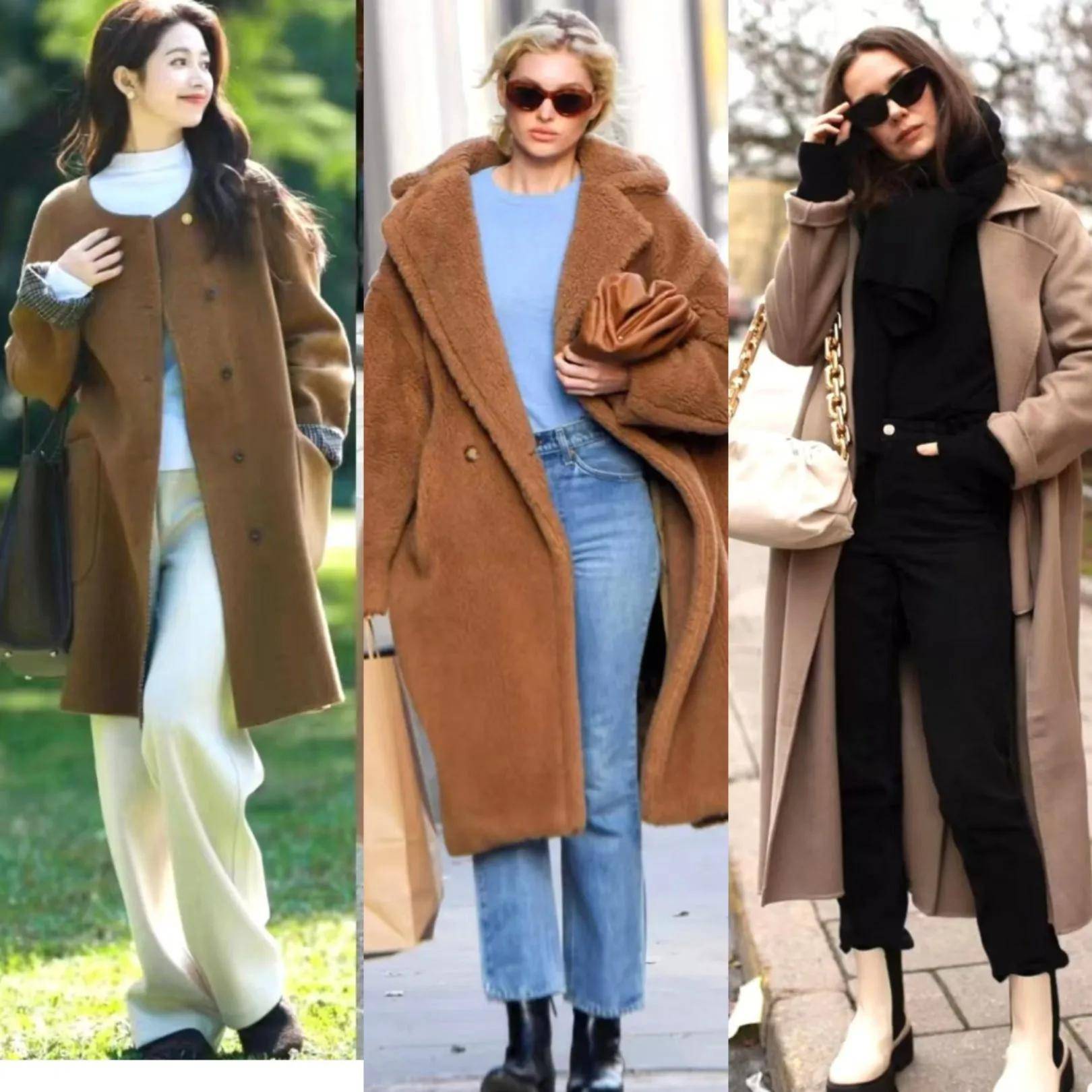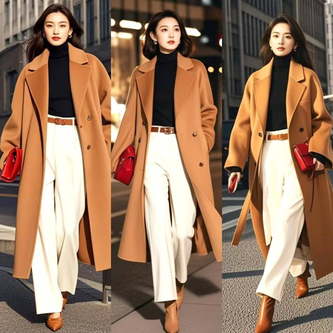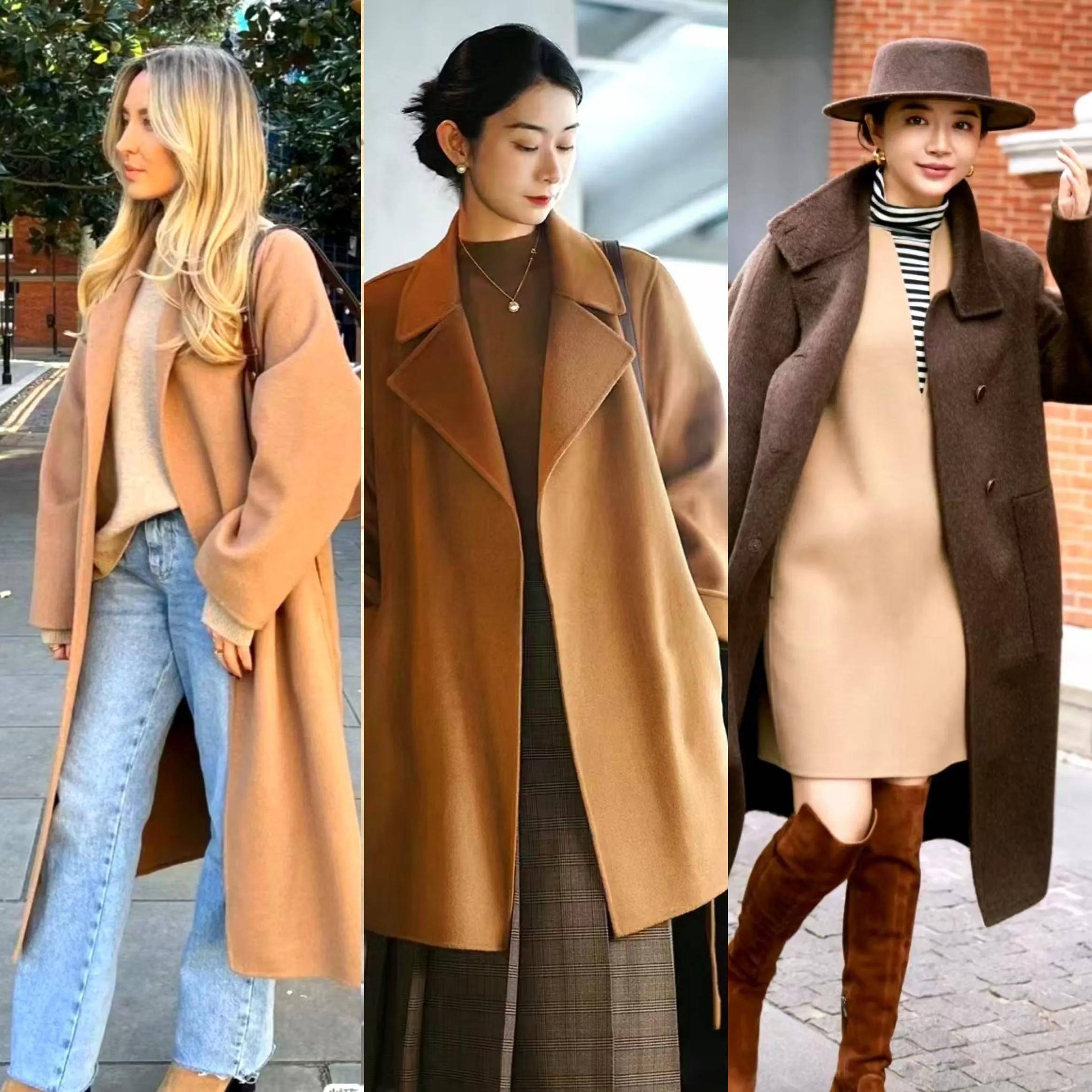 对于肤色偏黄的女性,建议选择颜色偏浅或偏红调的棕色大衣,比如驼色、焦糖色等,有提亮肤色的视觉效果。再搭配浅色内搭穿着,效果更佳。