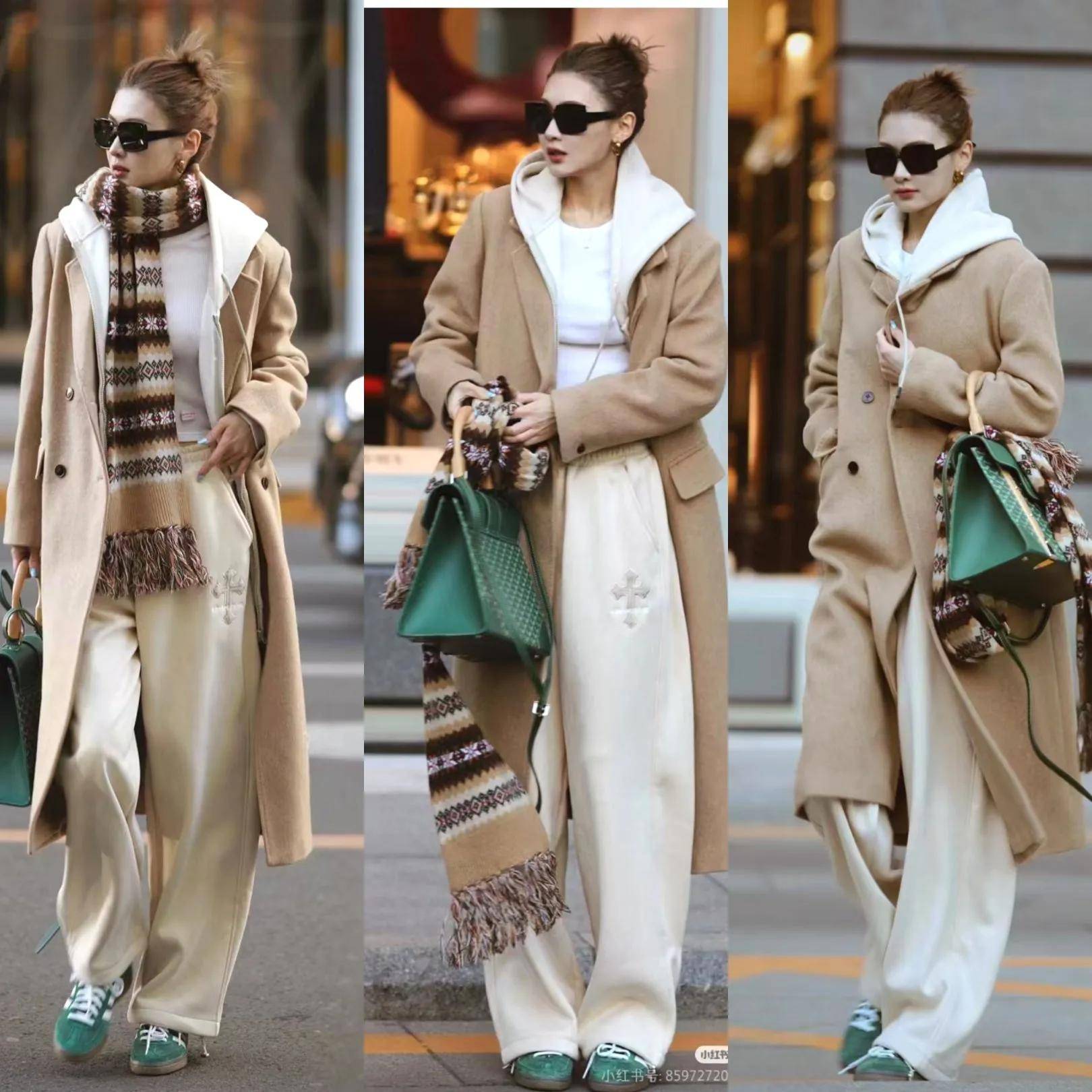 浅棕色大衣选择白色卫衣套装叠穿,内搭白色打底衫,敞开卫衣拉链穿着。棕色格纹围巾呼应造型,绿色德训鞋和包包点缀,增添造型活力感,呈现出休闲不失个性气质,时尚潮流。