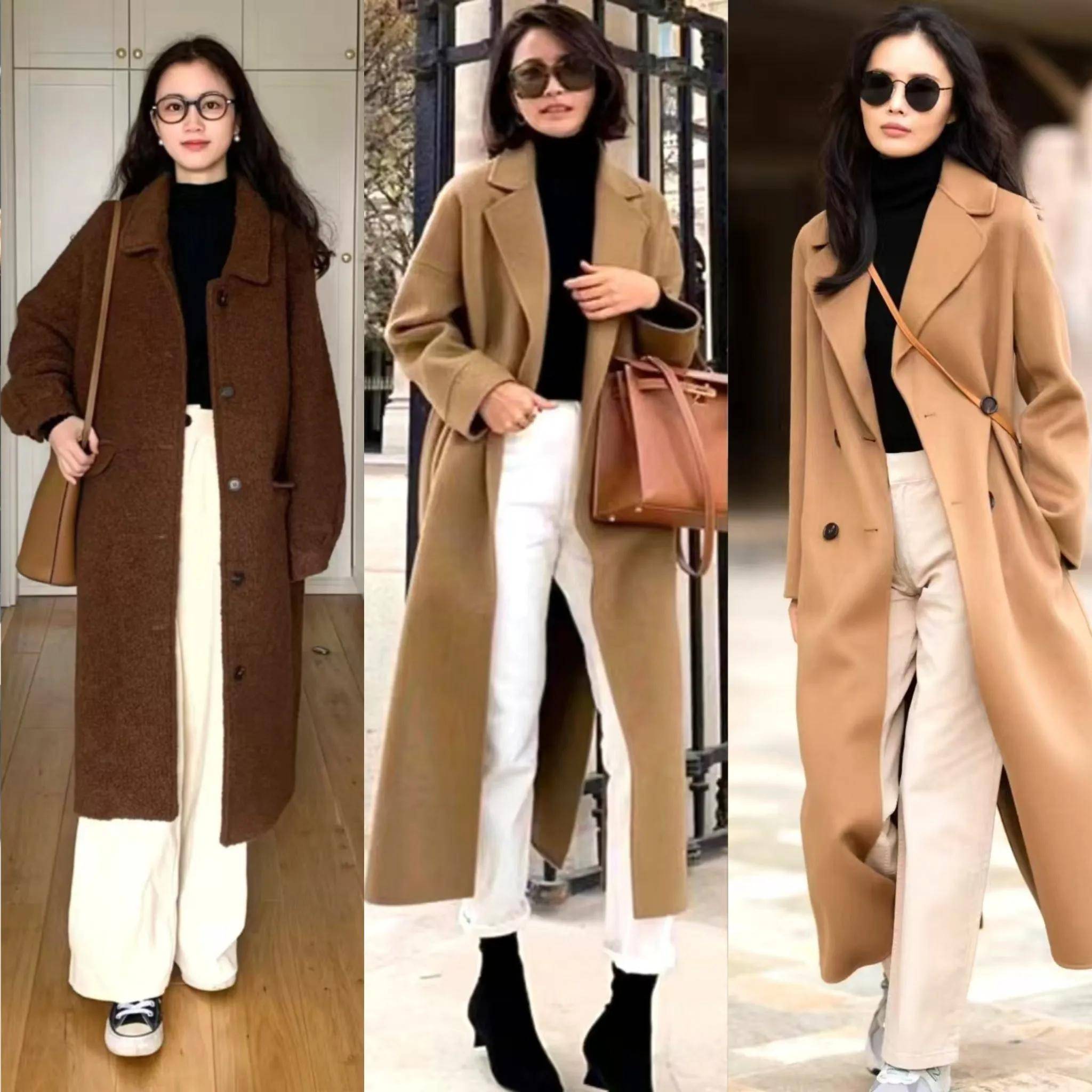 棕色大衣,很多人都喜欢敞开扣子穿着,大家第一眼看到的是内搭和裤子。这时候内搭与裤子颜色搭配就起到很重要的作用,也是决定造型是否好看时髦的关键。