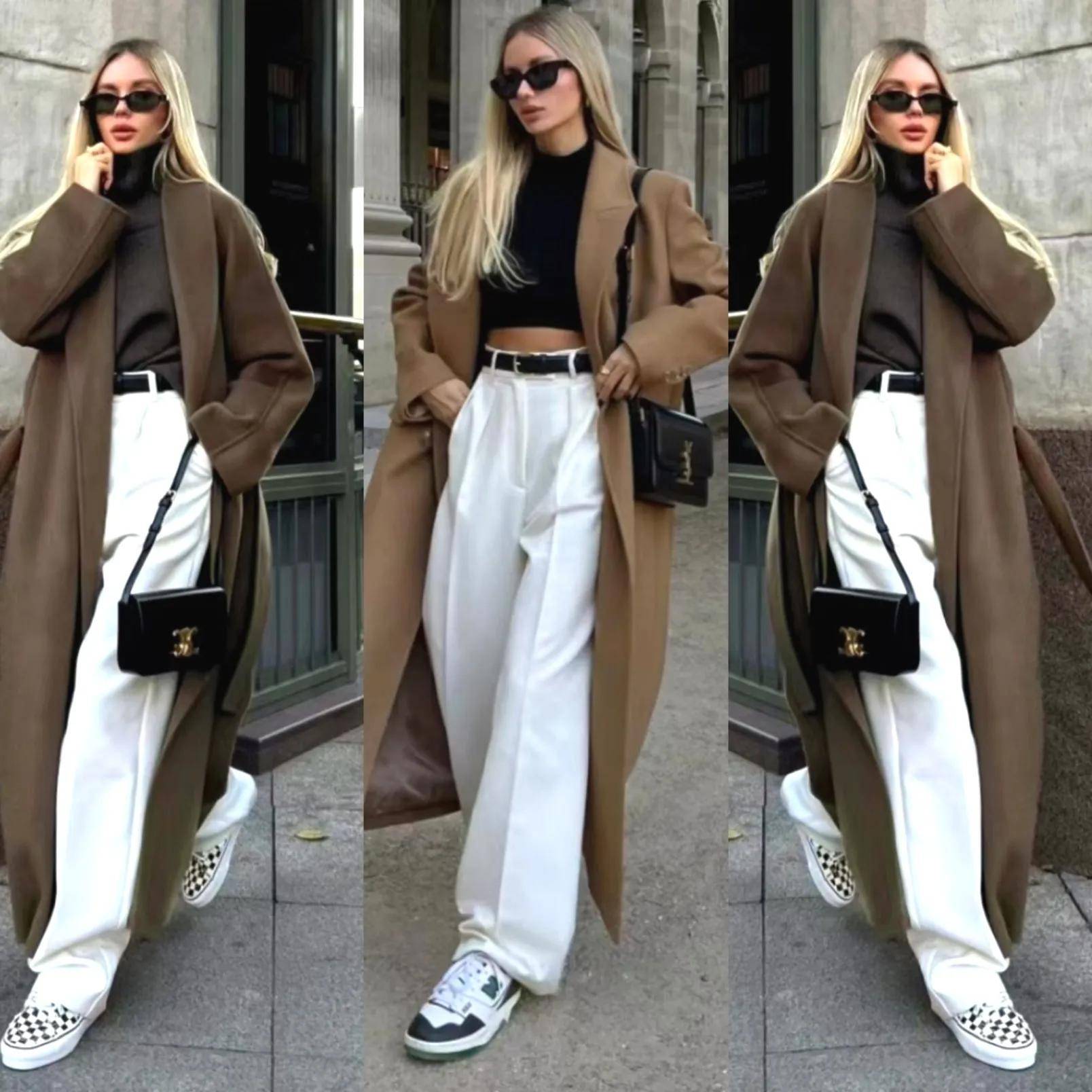 棕色大衣,选择灰色低领毛衣做内搭,衣摆折叠到裤腰处。白色帆布鞋与白色阔腿裤顺色延伸,拉长腿部线条。斜挎包与裤子颜色上下呼应,浅棕色围巾增加温暖感,打造出冬季优雅时尚不失休闲造型。