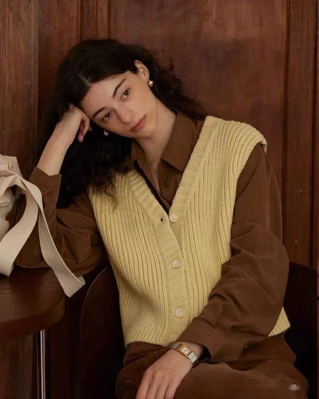 鹅黄色的毛衣马甲叠穿咖色衬衫,层次感分明,又带着暖暖的很慵懒的氛围,特别洋气的配色。