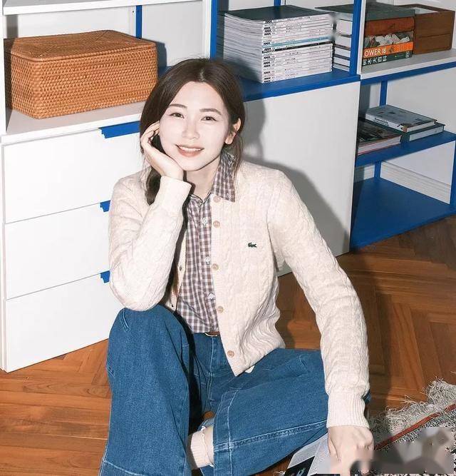 米色的毛衣开衫,里面叠穿咖色格子衬衫,属于大地色系的搭配,清新中带着温暖的腔调,优雅而精致。