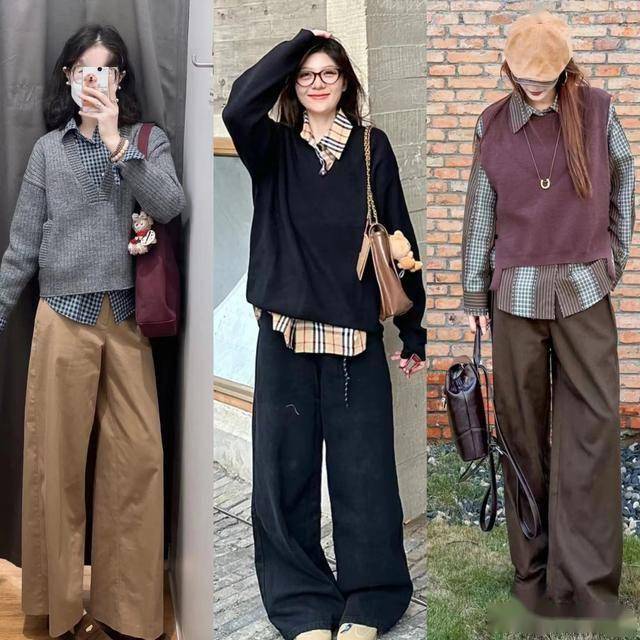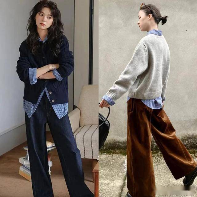喜欢松弛感的女生要,可以选择一件宽松的毛衣叠穿格子衬衫,搭配阔腿裤,一下子休闲随性的慵懒风就有了。