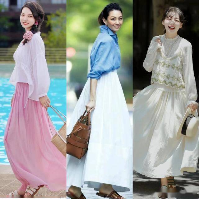 可以选择一条飘逸的雪纺或是亚麻的长裙,材质非常的轻盈,有种仙女的气质。 白色亚麻衬衫叠穿淡淡的绿色条纹背心,配上一条白色的亚麻长裙,整体的风格是简约而干净的,又充满了温婉软萌的少女感,清纯而可爱。 蓝色衬衫,简洁利落搭配白色长裙,增加了精致的女人味,很适合春天。