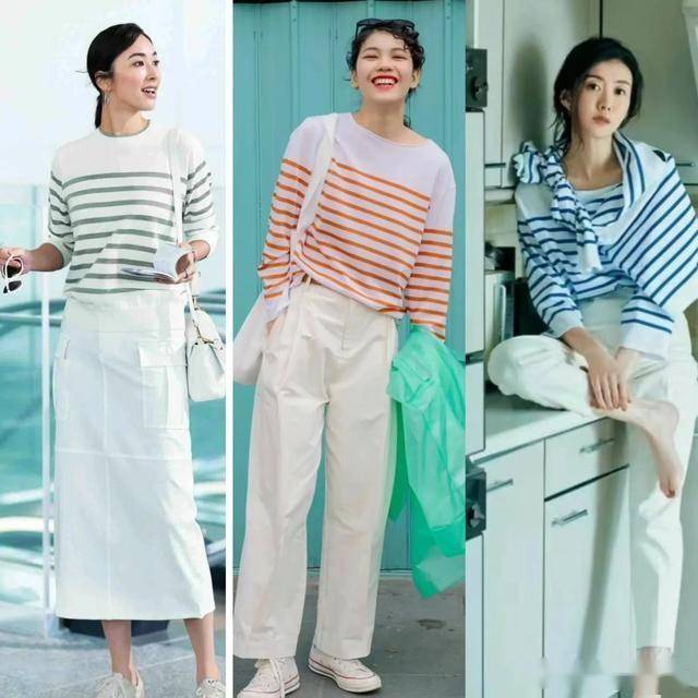 肤色不够白皙,很推荐条纹衫,尤其是蓝白条纹、红白条纹、黑白条纹等,都特别显白,搭配白色下装,超级显白减龄。 蓝白条纹衫,带着少年的清爽感,搭配白色烟管裤,配色非常干净,看着很盐系。