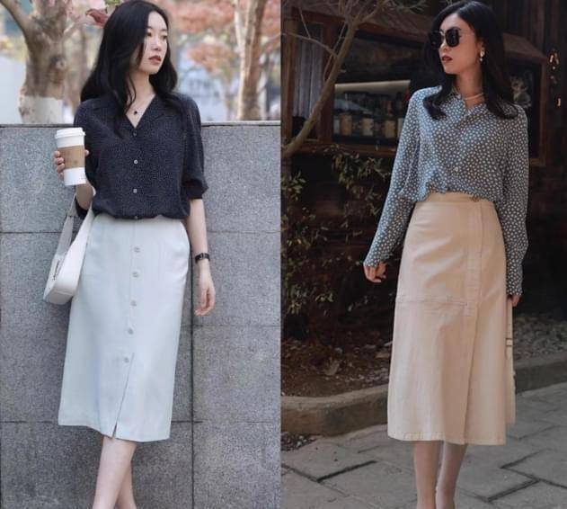说到了具体的搭配,你可以试试这种衬衫和半身裙的搭配组合,短衬衫配上高腰的半身裙,优雅又时尚,记得要把上衣塞进裙子的腰间,这样的搭配目的在于凸显出腰线,避免臃肿。 关于鞋子的选择,我也建议你可以试着搭配高跟鞋,比平底鞋更增高,还能展现出优雅气质,女神范儿十足。