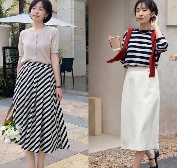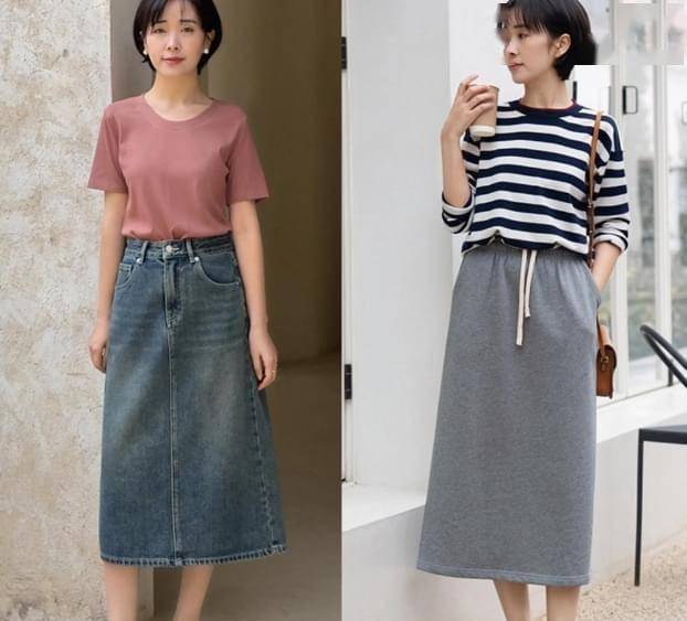另外,休闲的T恤和半身裙的搭配组合也很常见,日常生活中上年纪的女人也不想穿的用力过猛,那么就可以选这种纯色T恤或者是条纹的T恤,展现时尚感,而下半身的高腰半身裙又可以延续这种休闲的气质,并且遮挡住胯宽腿粗的问题。 像这些女生选择牛仔裙或者是运动裙都相当的时髦和减龄哦,搭配平底鞋也相当舒适。