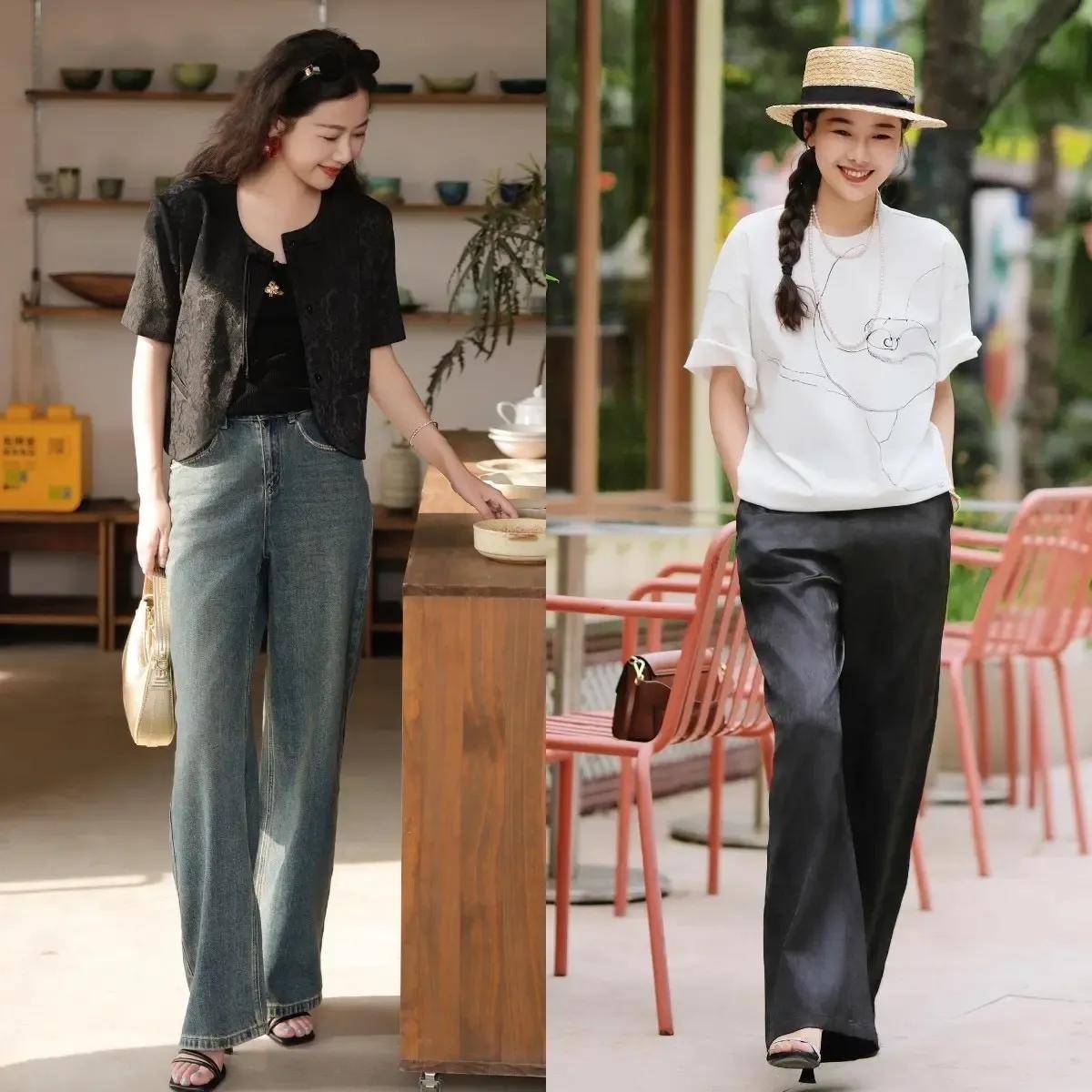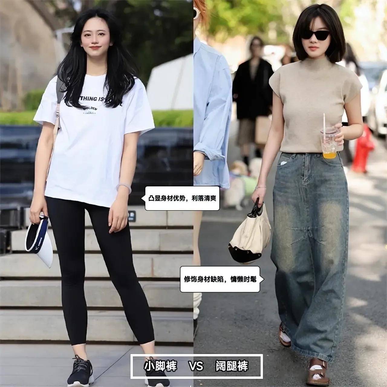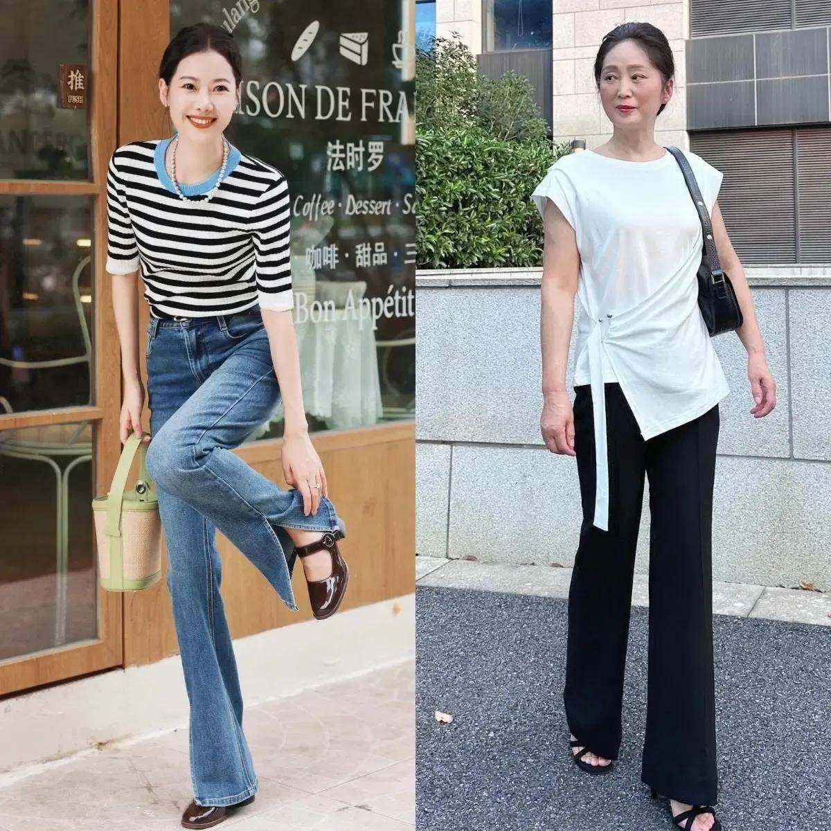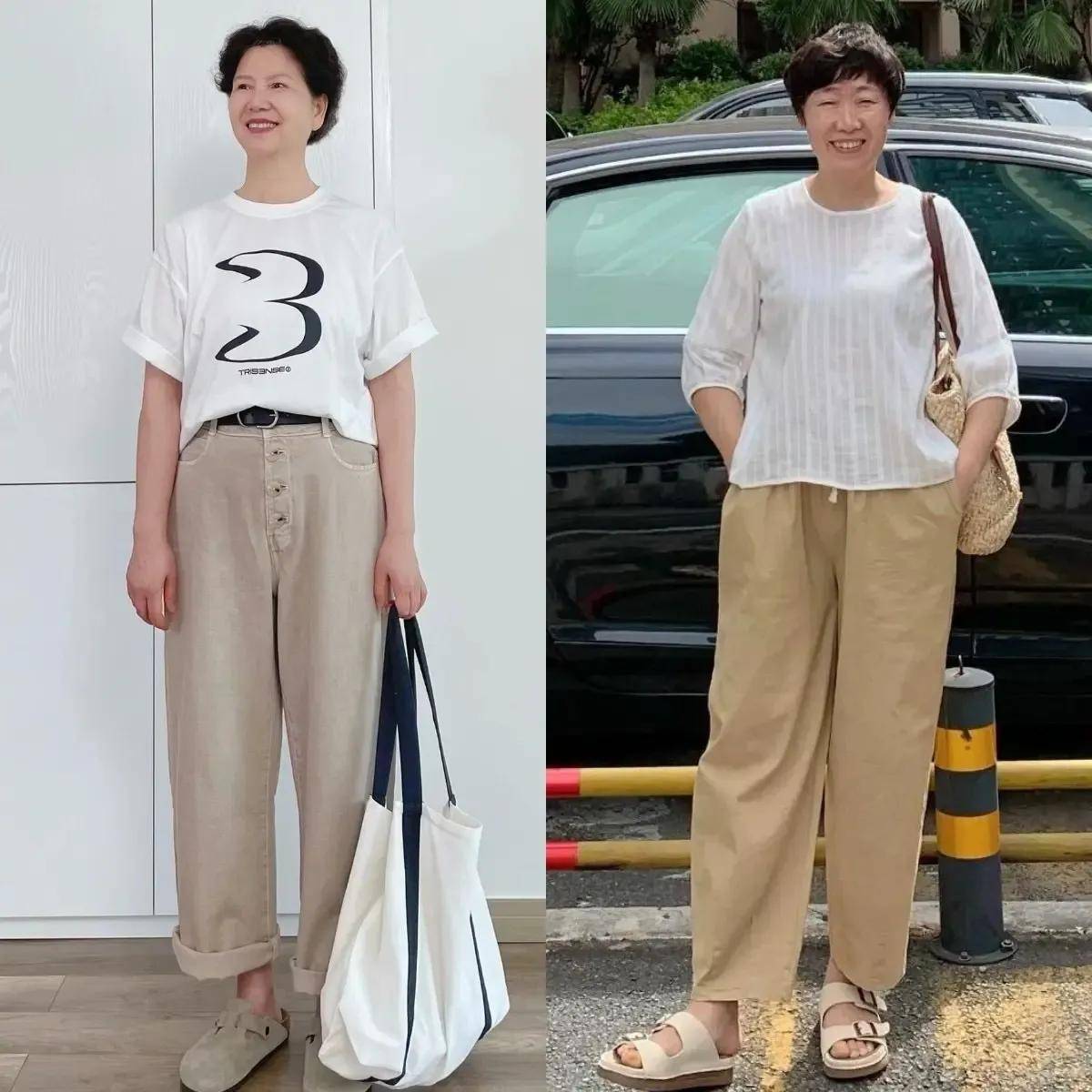 人们常幻想,穿上紧身裤会像某些时尚达人一样,白色T恤配黑色鲨鱼裤,配上一双黑色运动鞋,简洁、利落,身形曲线尽显,仿佛成了街头的焦点。可是,大多数普通人却常常无法复制这种效果,穿出来的样子反而让人感觉格外拗口。比如,一位穿着紫色短袖搭配九分修身牛仔裤的女性,所展现的形象非但未能散发出时尚感,反而显得有些廉价,暴露了腿部的不足。与其让人看出缺点,不如选择一条直筒牛仔裤,搭配上简约的黑白条纹上衣,整体造型则显得清新又洋气。穿上修身紧身裤的确能勾勒出美丽的身形,但适合年轻女孩,尤其是身材纤细的00后。对于步入中年的人来说,还是直筒裤、阔腿裤这样的经典单品,才最能凸显出成熟稳重的韵味。就像两位中年女性,她们选择了简单的白色衬衫和卡其色直筒裤,再搭上一双平底鞋,穿出了一种不张扬但却异常迷人的风采。