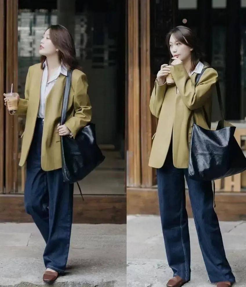 职场女性的穿搭不应太过花哨,简约利落的西装外套必不可少。若能避免黑色,选择灰色或大地色的西装,会更显得干练且具现代感。例如,灰色西服外套配浅紫色条纹衬衫,再搭配蓝色牛仔裤与棕色皮鞋,整体造型简洁大方,给人一种清新的感觉。而如果选择上短下长的搭配方式,也能轻松展现出迷人的身形比例,提升整体气质。