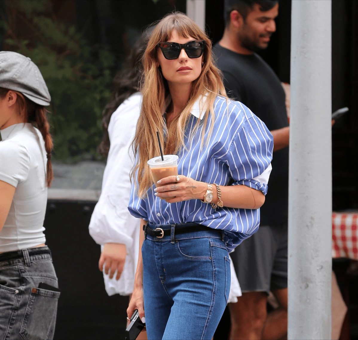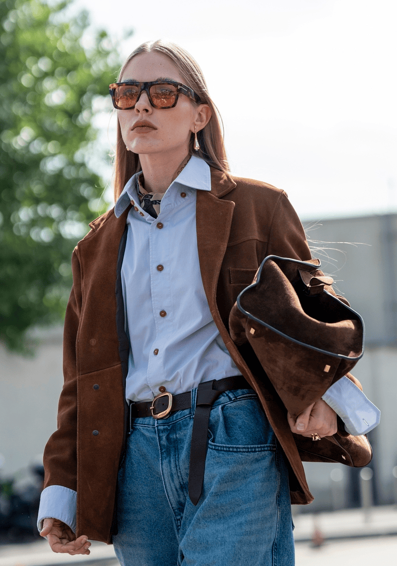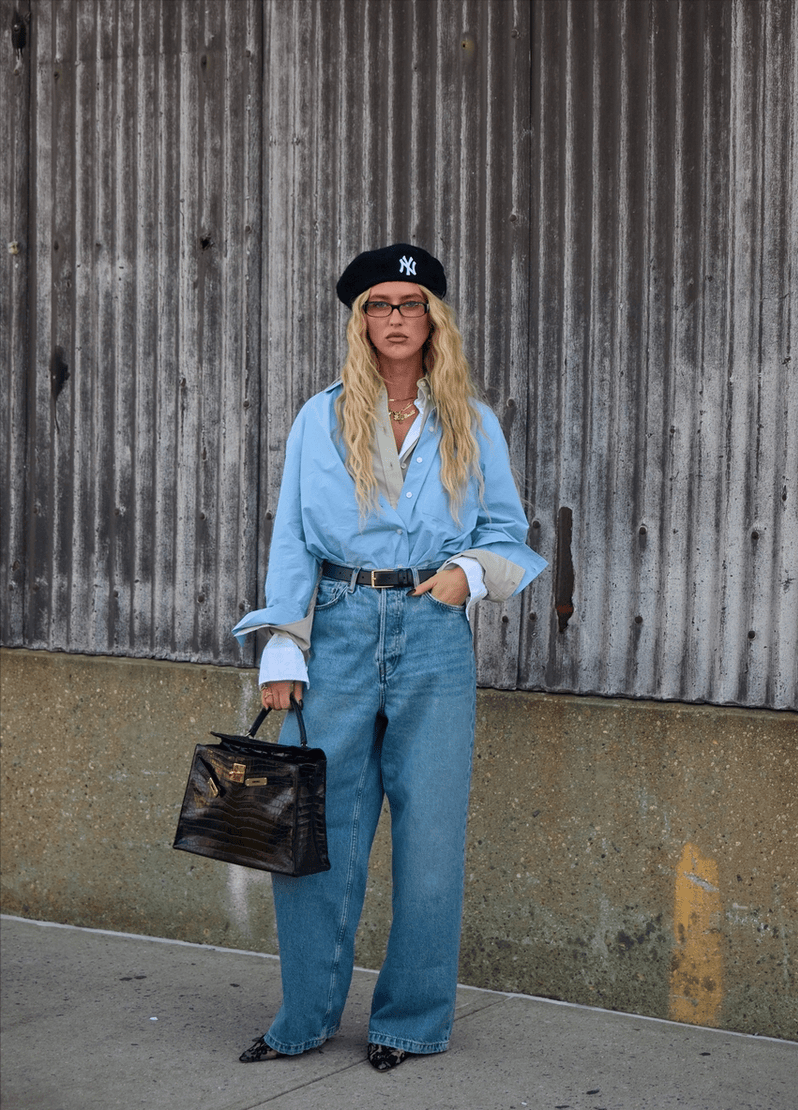 除了经典的条纹,干净利落的蓝色衬衫同样是这个风格的代表单品之一,辨识度极高。