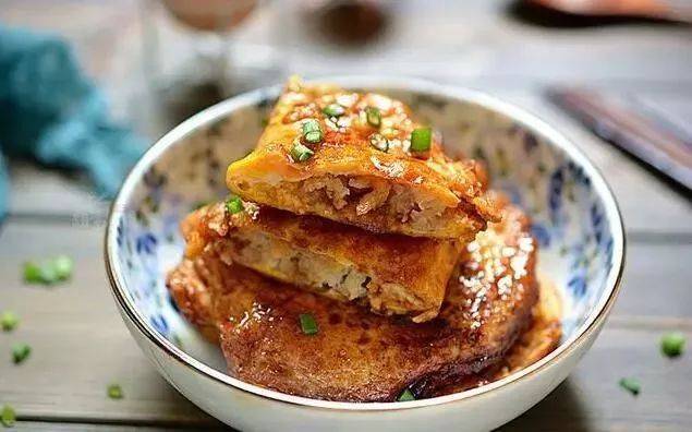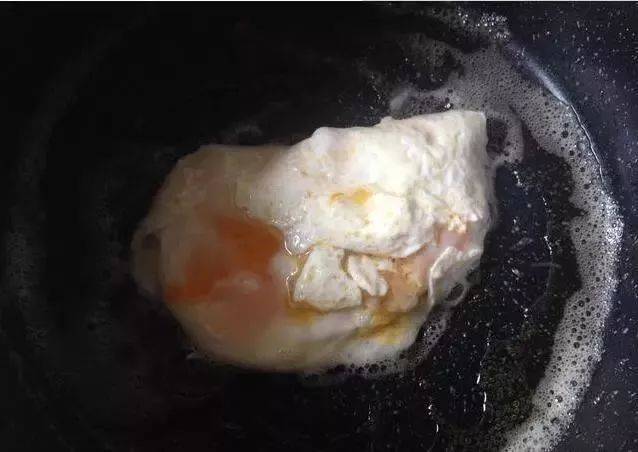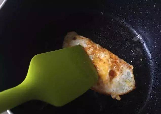 5、待鸡蛋底面煎的稍微硬点,再把上端折过来将肉馅盖住,就像做蛋饺一样