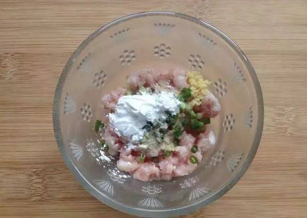 2、猪肉末中放入盐、葱花、姜末、白胡椒粉、玉米淀粉、鸡精,顺一个方向搅拌上劲