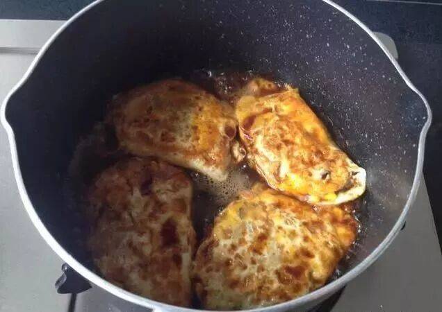7、4个鸡蛋煎好后都放入锅中,倒入调料汁,盖上盖,中小火煮2分钟