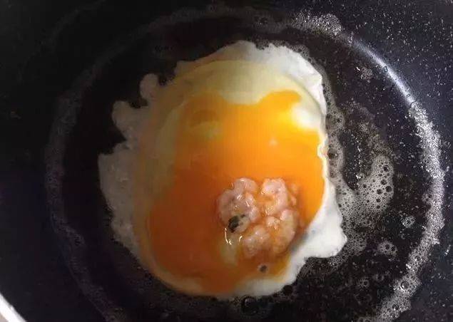 4、锅中倒油烧至5成热,打入一个鸡蛋,用筷子将蛋黄划散,把肉馅放在蛋黄上