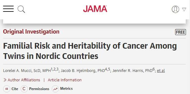 2016年《JAMA》又刊登了一篇来自哈佛大学科学家与丹麦和芬兰研究员的研究报告,指出至少有22种癌症具有高度遗传风险,如果家族中有父母或兄弟姐妹曾经患癌,那么其它成员患同样癌症的几率也会上升33%。