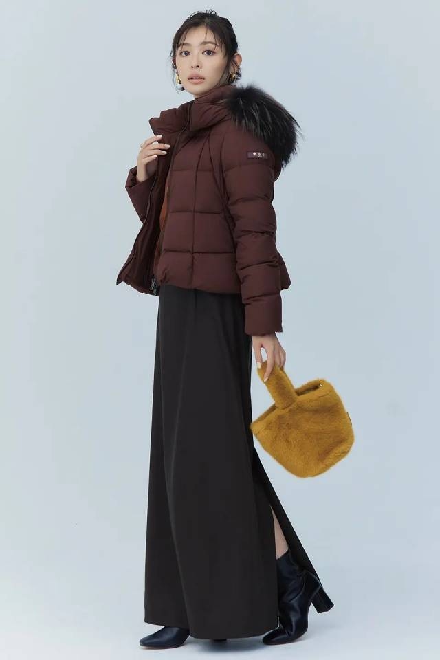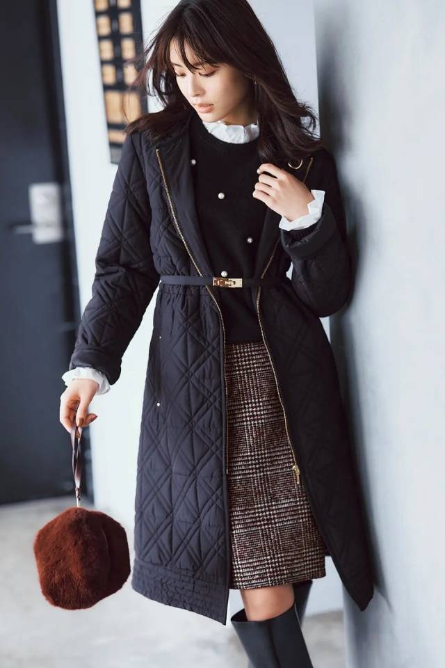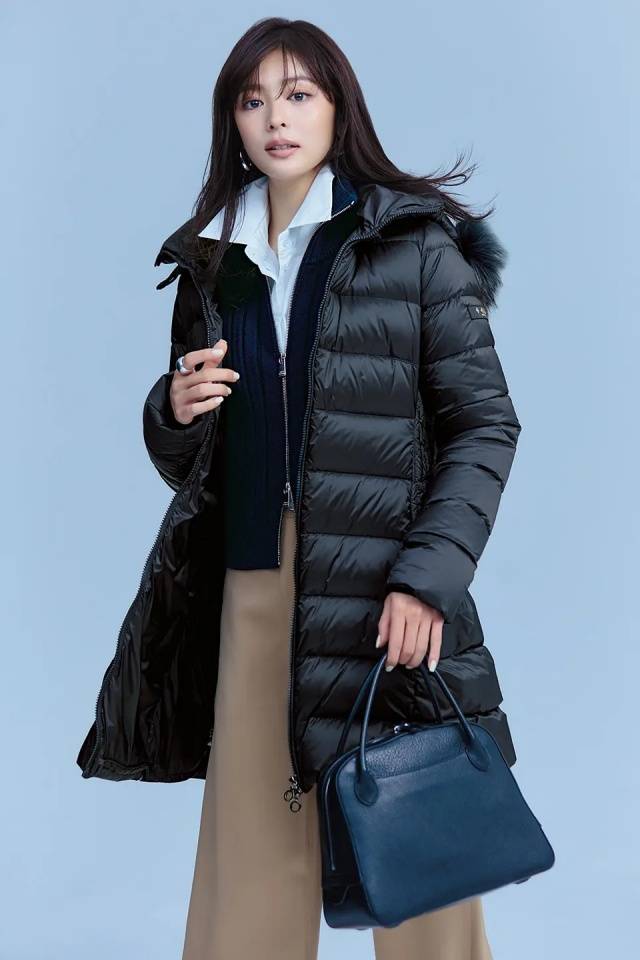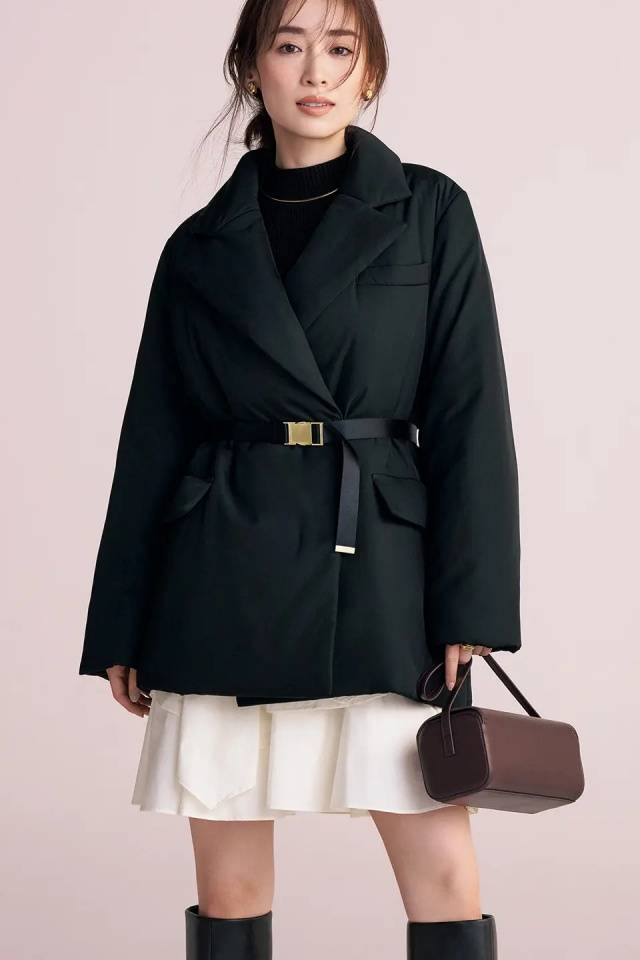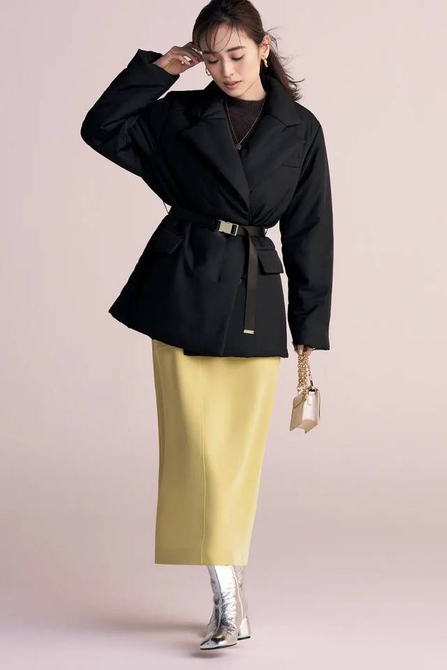 优美的剪影与适度的哑光光泽,即使是迷你长度的裙装也能展现优雅。面料内含蓄热功能的夹棉薄片,采用轻薄片状夹棉,兼顾温暖与利落外观。