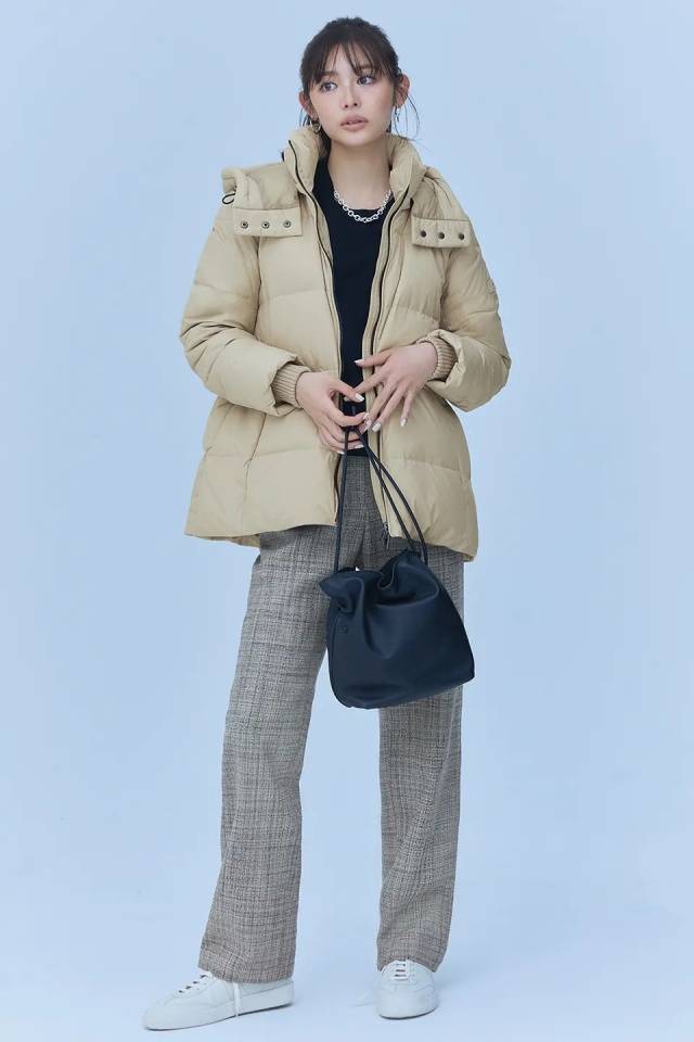 抽绳拉长后呈现流畅的A字廓形。前襟采用拉链设计,无门襟的敞开式穿着更显利落纤细。无论是大翻领衬衫、蝴蝶结领衬衫还是粗花呢长裤,与上镜单品的搭配都相得益彰,尽显精致韵味。材质轻薄,即使在严冬外搭羊毛大衣也依然优雅得体。
