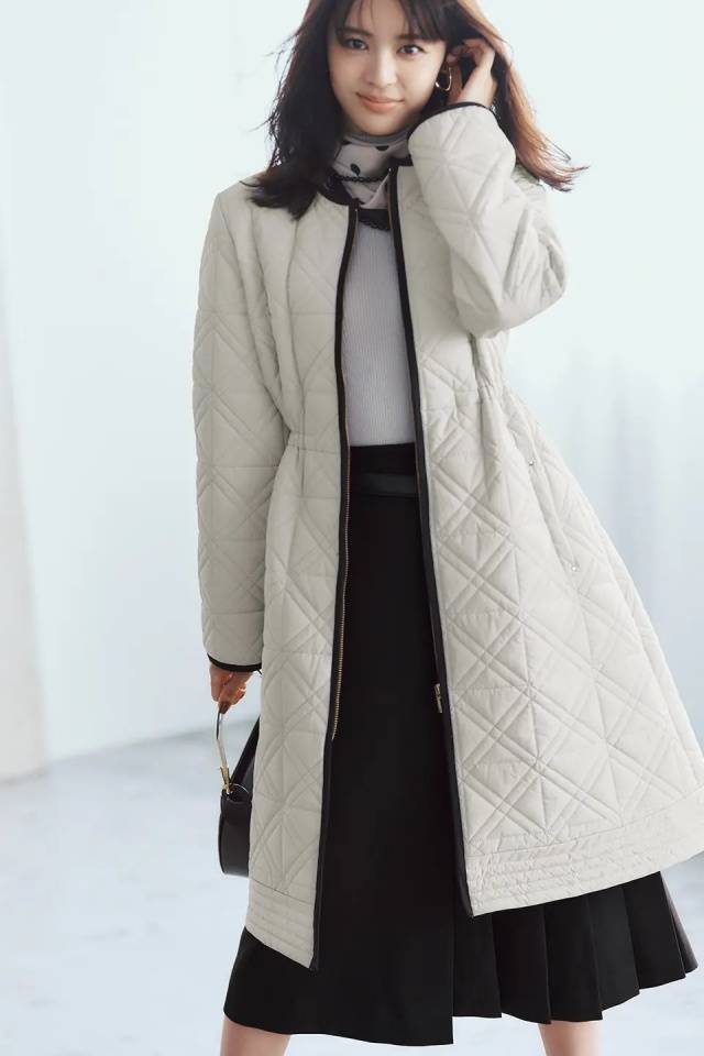 将容易显得运动风的中棉绗缝外套,通过搭配菱形花纹与直线剪裁,焕发现代时尚气息。灰米色款采用黑色滚边的双色设计,呈现清新风貌。收紧背后腰部的抽绳,即刻切换为轮廓分明的利落造型!
