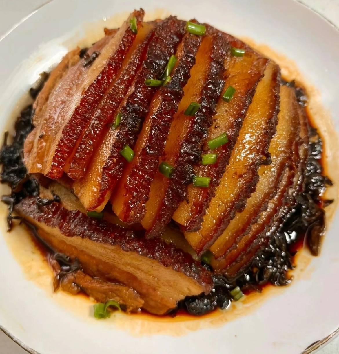2. 将浓好的酱汁均匀淋在扣肉上,撒上少许葱花点缀,即可上桌。关键技巧&避坑指南1. 炸肉皮时一定要擦干水分,小火慢炸,避免油溅烫伤;若担心危险,可在锅中盖一层锅盖(留一条缝透气)。