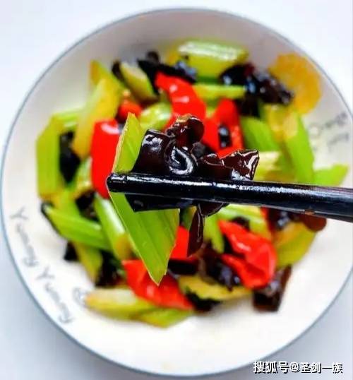 1. 芹菜斜刀切段,木耳温水泡开;水加少许油和盐烧开,放入芹菜、木耳焯烫 1 分钟,捞出过凉水备用。