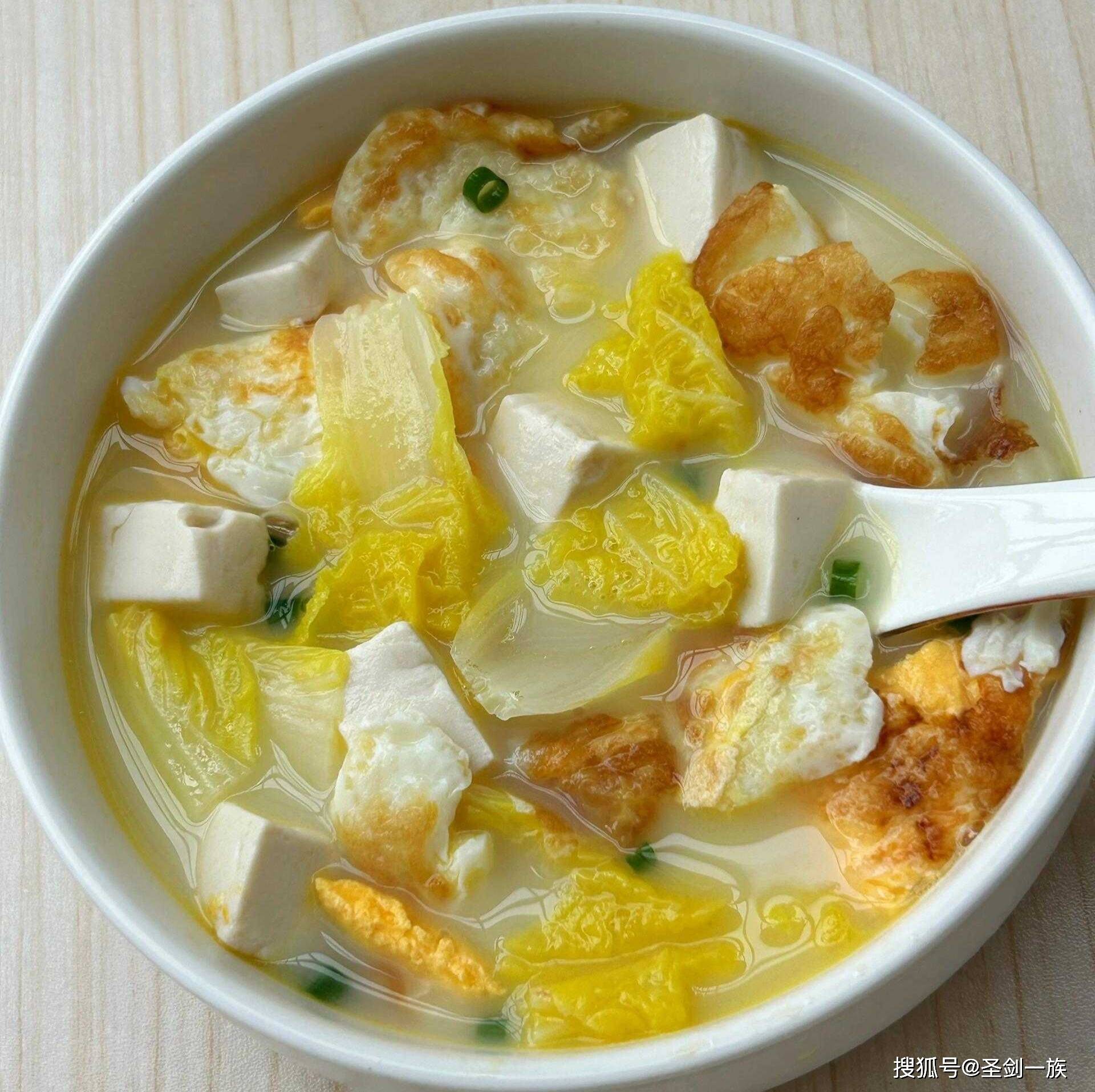 所需食材:嫩豆腐1块、娃娃菜2棵、鸡蛋1个、葱花少许、盐适量、鸡精少许、食用油适量、清水适量。